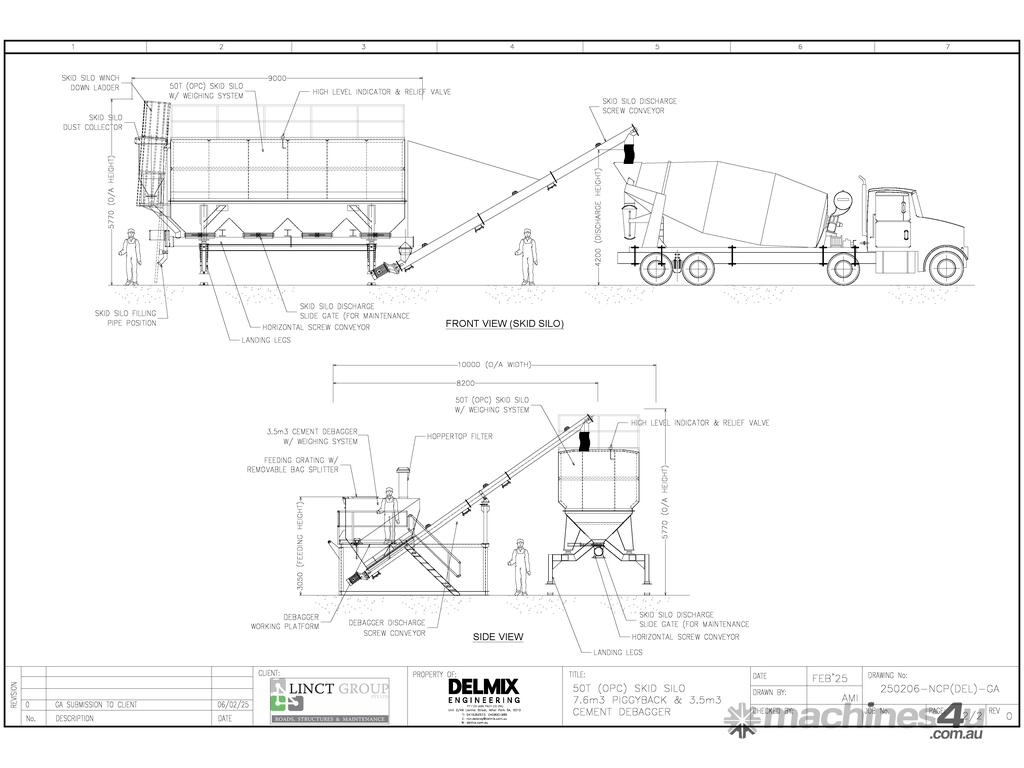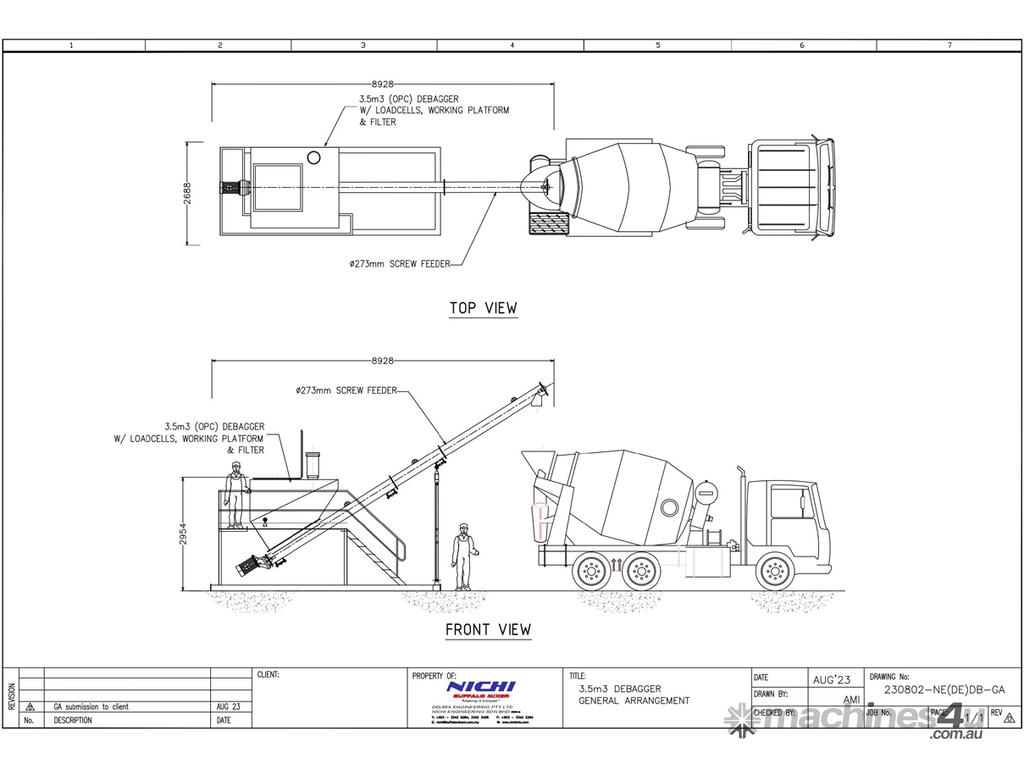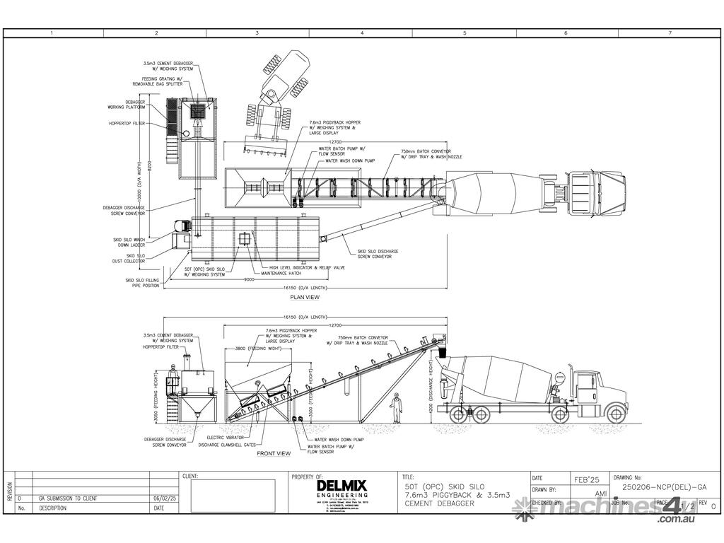 This unit is 3.5 Cubic Meters or approximately 5 tons. The unit is on load cells with a Rinstrum Weighing System which can per preset for up to 100 options. The system works on a weigh out principal either into a Silo or into the truck . It can be confirmed with our Compact Batching Pant and run off the one control panel. I comes with a Wam reverse pulse filter and Vibrator . Wiring to Australian Standards and transportable on a drop deck Trailer