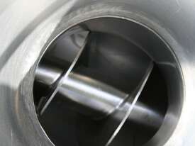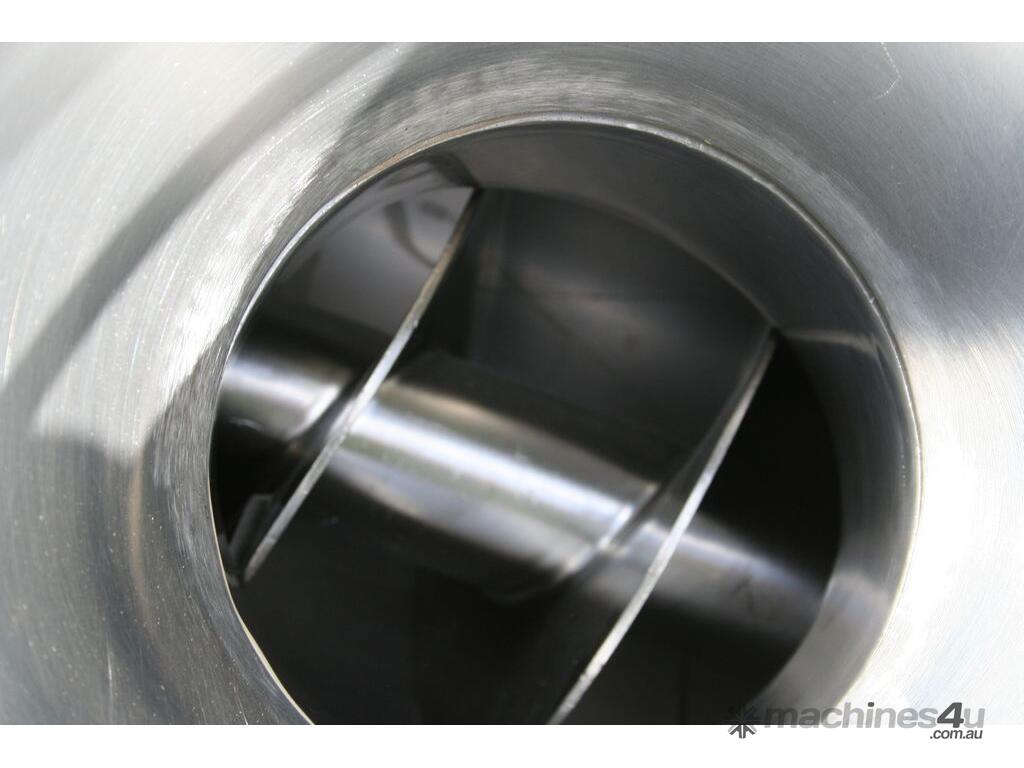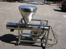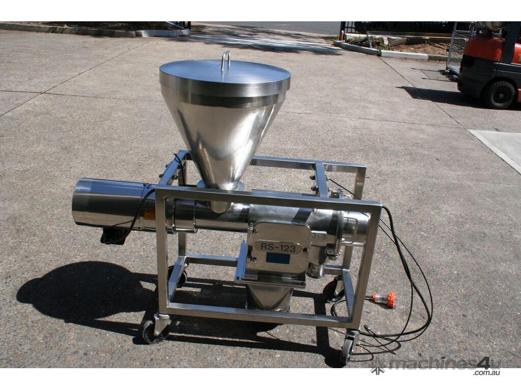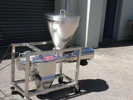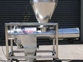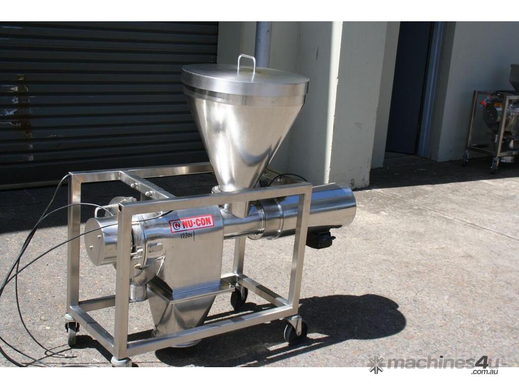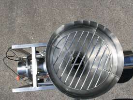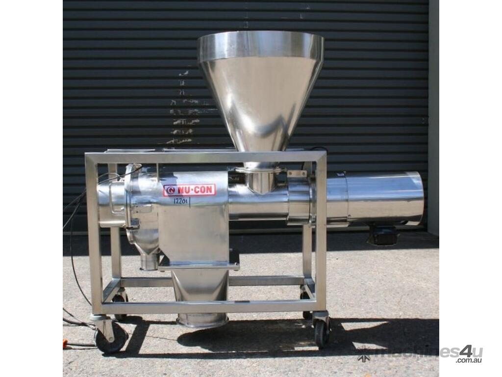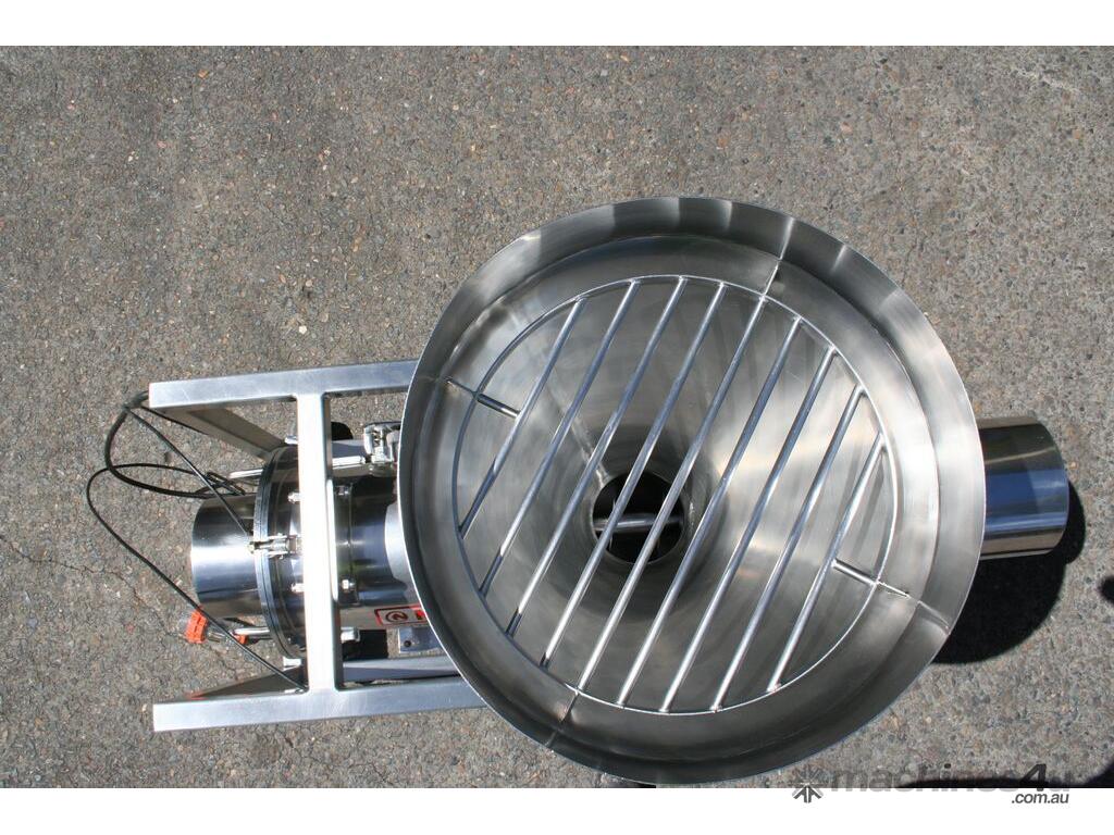 Centrifugal Rotary Sifter Sieve, "Nucon", Model 20 U Sifter, all stainless steel parts and complete with a 500mm dia hopper with lid and safety grill, then feeding an Auger screw infeed into the chamber, with paddles and a 200mm dia centre bottom outlet, 3 phase 950rpm 0.75kw motor, mounted on a mobile stainless steel frame.