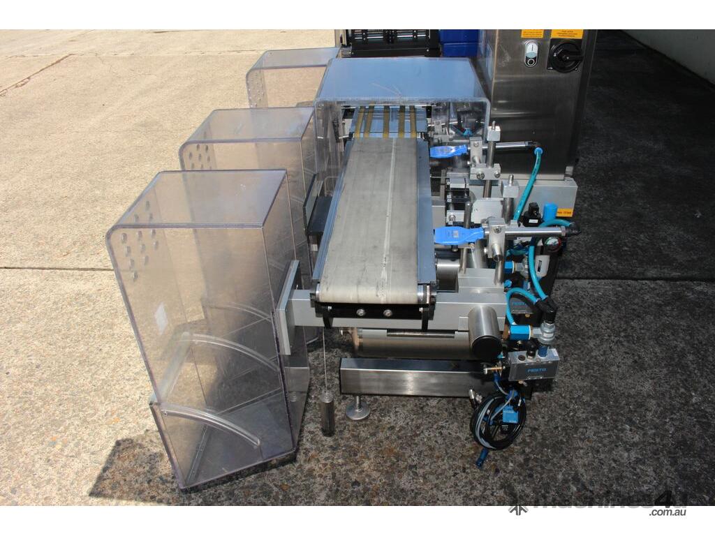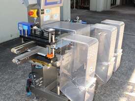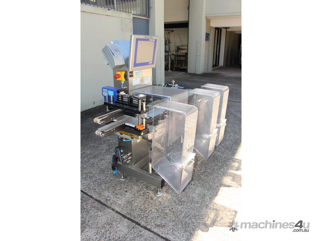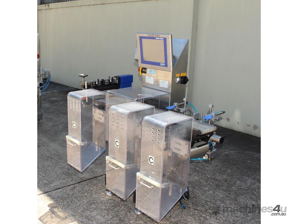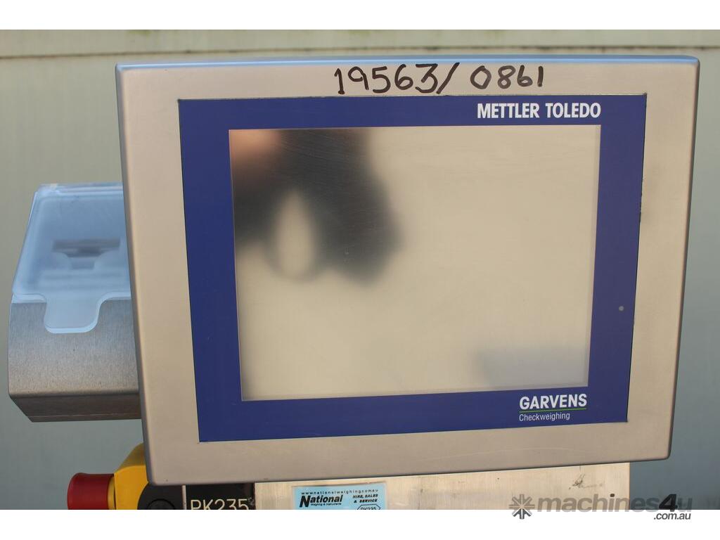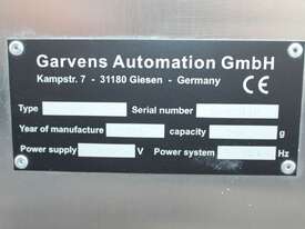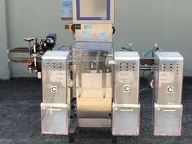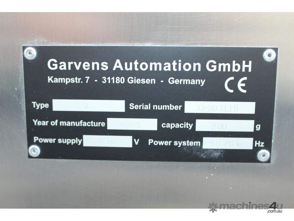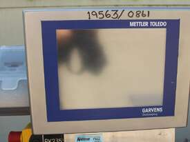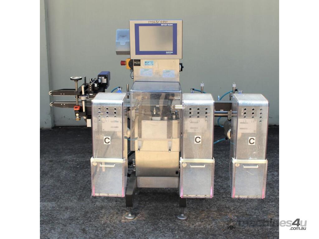 Checkweigher, "Garvens" model S2, capacity 200g 0.01gm (may be able to be recalibrate to a greater range), with integrated conveyor, air jet rejection system, provided with open flap detection and mechanical transfer system with top and bottom belt ,touch screen indicator, three clear acrylic rejection bins, complete stainless steel structure