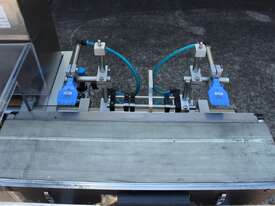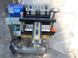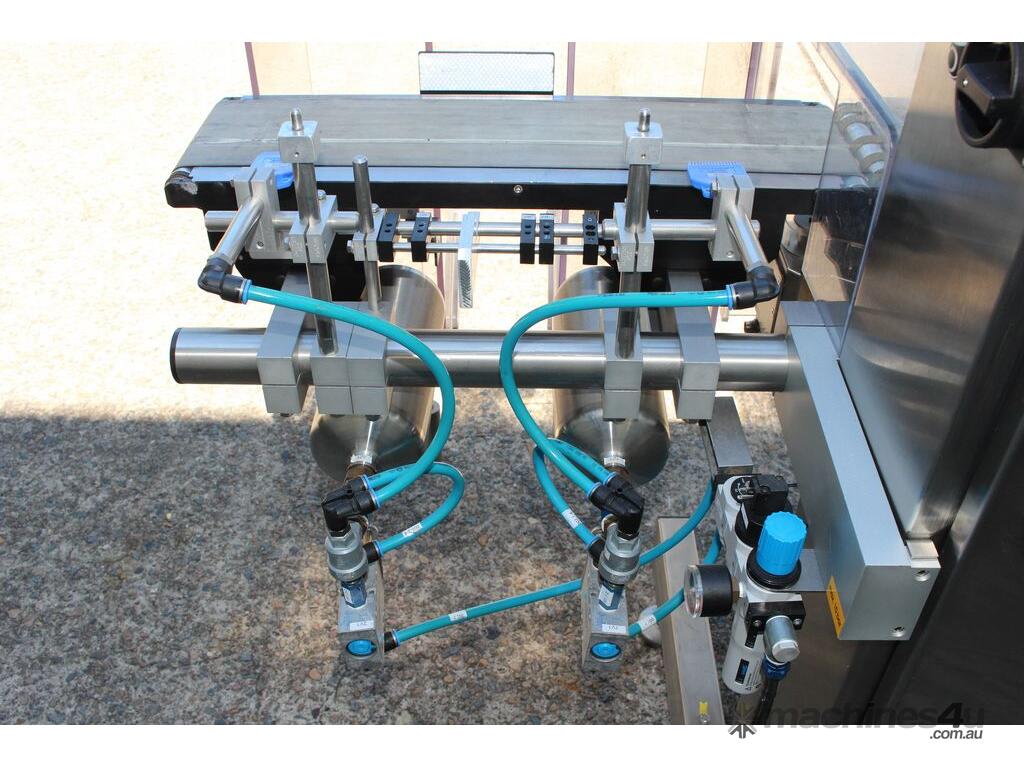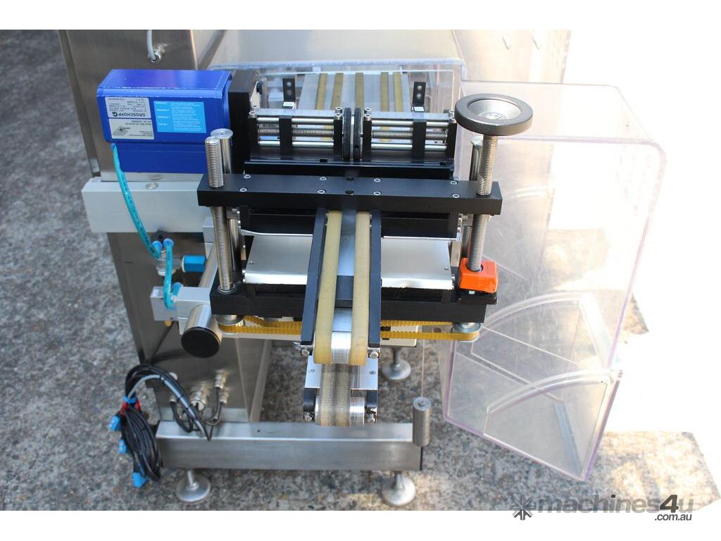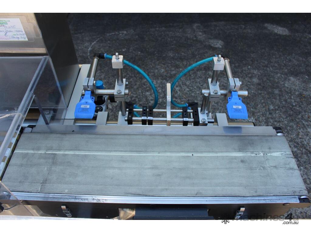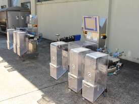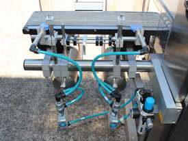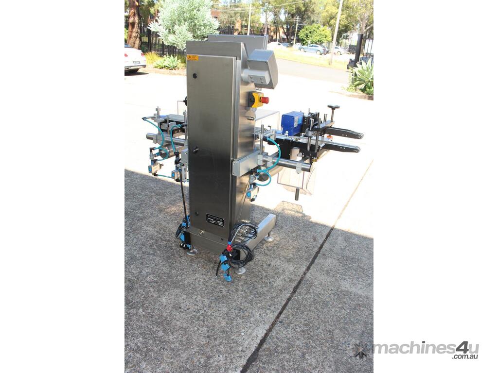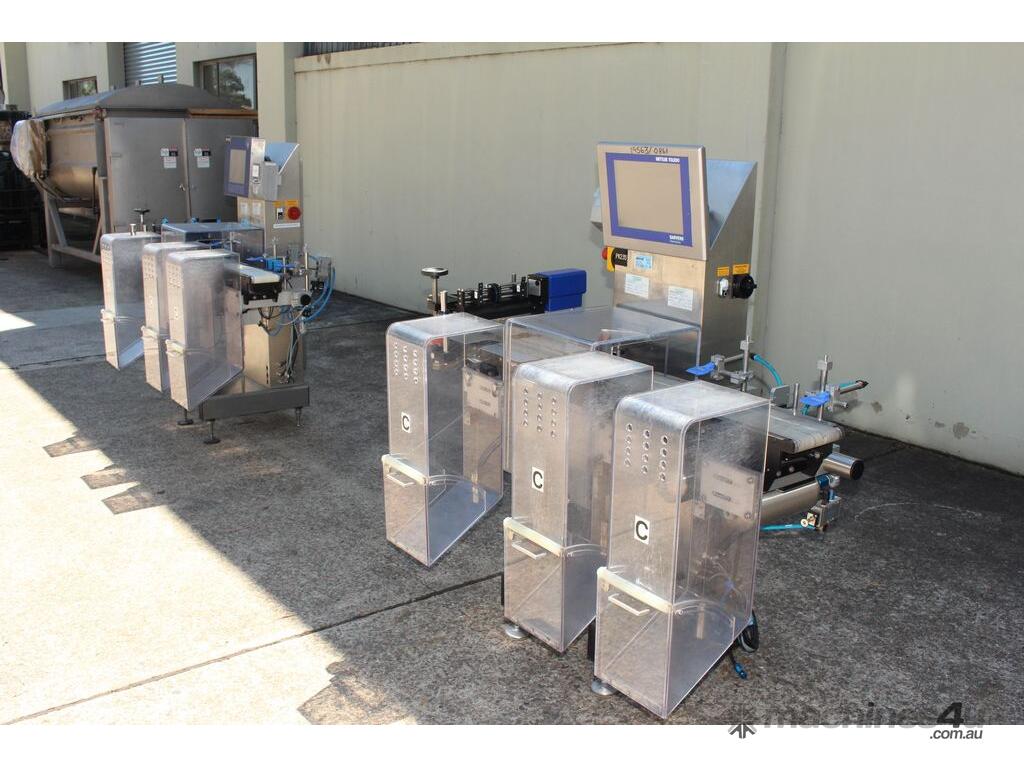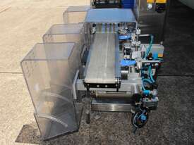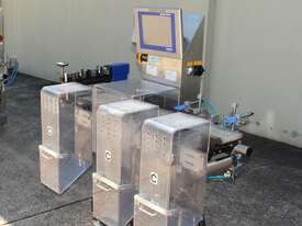 Checkweigher, "Garvens" model S2, capacity 200g 0.01gm (may be able to be recalibrate to a greater range), with integrated conveyor, air jet rejection system, provided with open flap detection and mechanical transfer system with top and bottom belt ,touch screen indicator, three clear acrylic rejection bins, complete stainless steel structure
