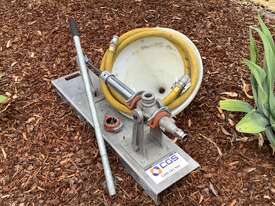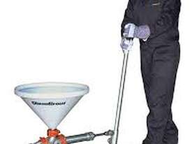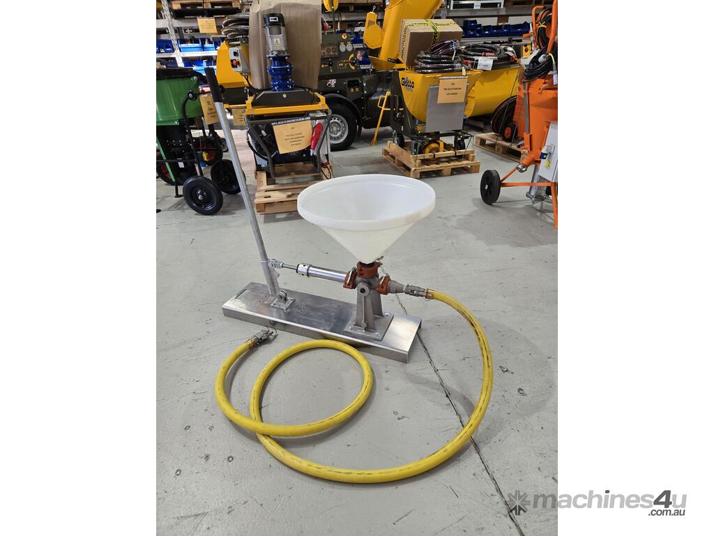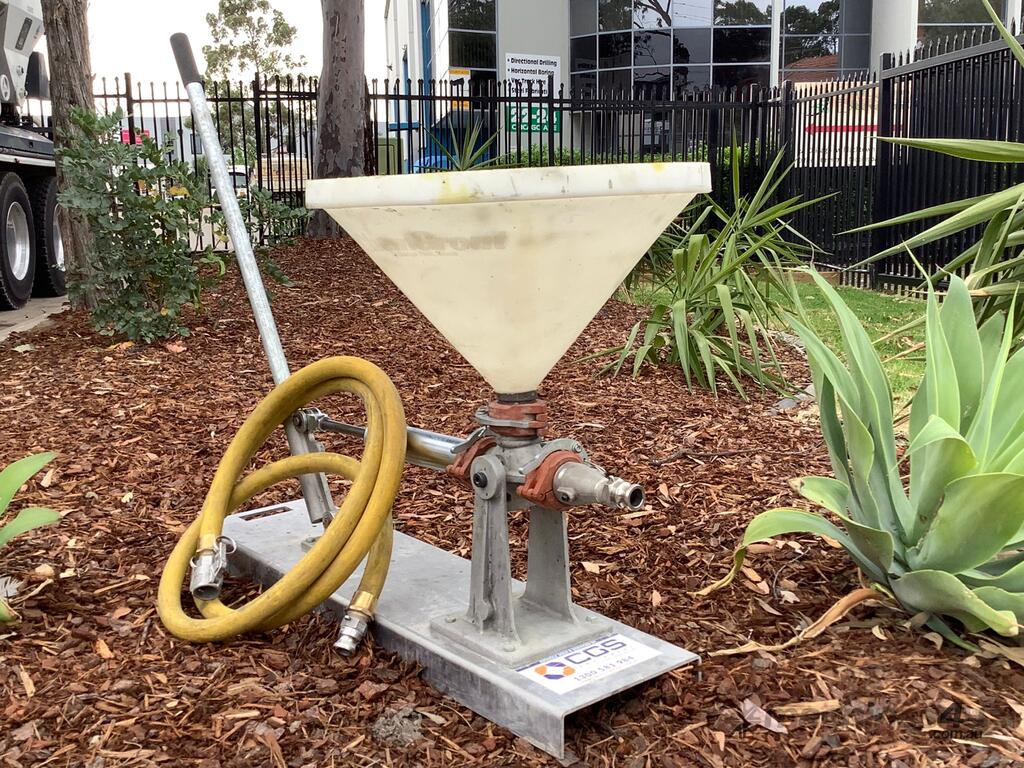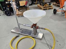 This hydraulic-powered grout pump is designed for ease of use and mobility, particularly in areas lacking air or electric power sources. It includes a 5-gallon holding hopper connected to the suction of the durable 2” positive displacement piston pump, ensuring continuous pumping operations.