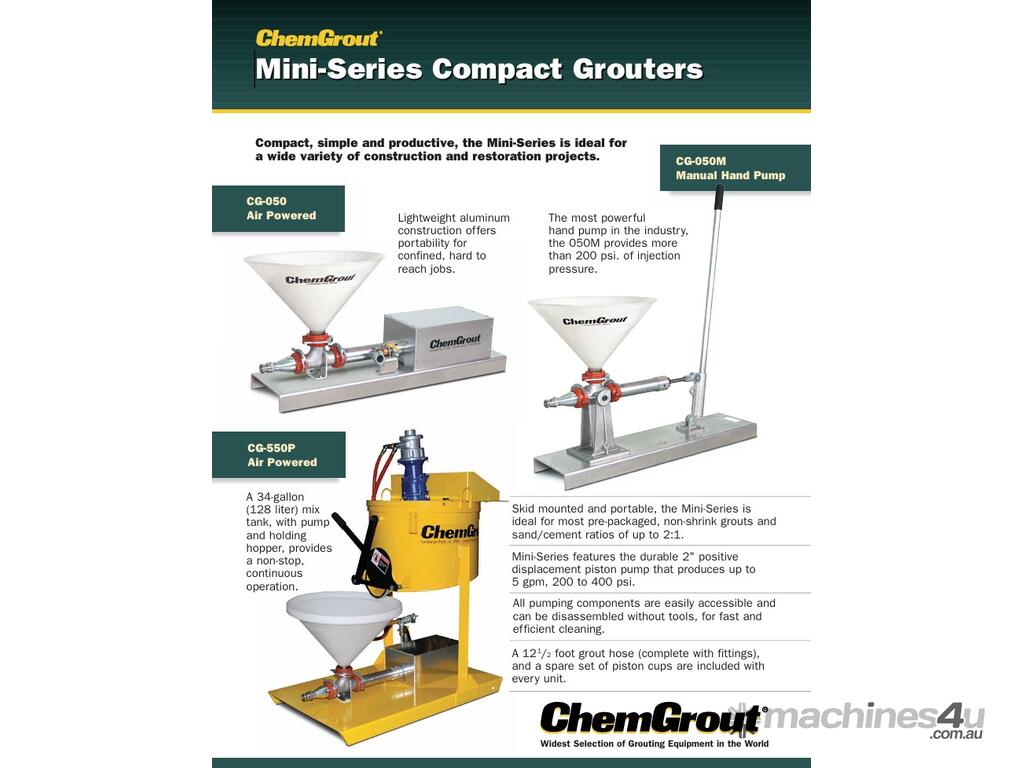 The ChemGrout model CG-050M is a portable, skid-mounted grout pump. It’s lightweight aluminium design makes it an ideal solution for smaller jobs.