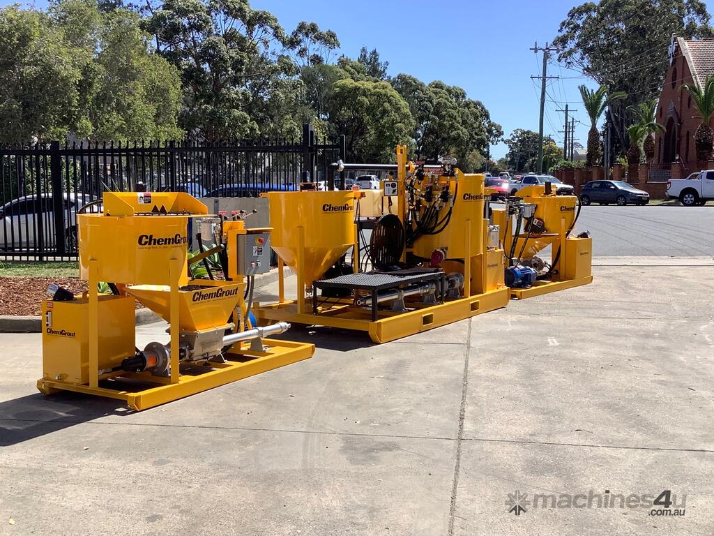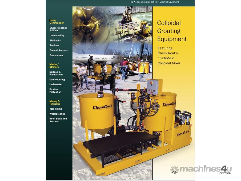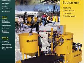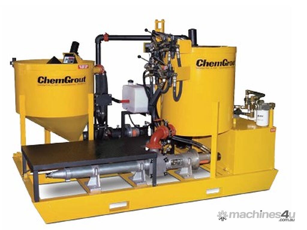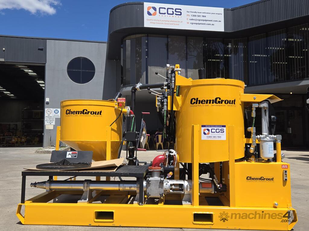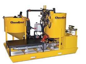 The ChemGrout CG-600 High Pressure series is a skid-mounted, colloidal grout plant. This unit is available with a 13 cubic foot high shear colloidal mixer, an agitated storage tank and a high-pressure plunger grout pump. The colloidal mixer is equipped with a high shear centrifugal diffuser-type pump that disperses the cementitious material down to its finest particle size to achieve complete particle wetness. The mixing tank is equipped with a bridge breaker to break apart the material before entering the colloidal mixer. The agitated storage tank is 13 CF and equipped with a variable-speed high-efficiency paddle mixer that maintains a thoroughly mixed grout while waiting to be pumped. The grout pump is connected to the agitated storage tank to provide a continuous pumping operation. The grout pump is a double-acting, positive-displacement, plunger style that is available in three different sizes, 3X8 and 2X8, offering discharge pressures of 1,000 psi and 2,000 psi, respectively. The double-acting plunger pump is designed so that conversion between the pressure outputs is easy and cost-effective. Operator controls are centrally located for efficient production. The pump has patented fasteners that dramatically reduce disassembly time for cleaning and maintenance.