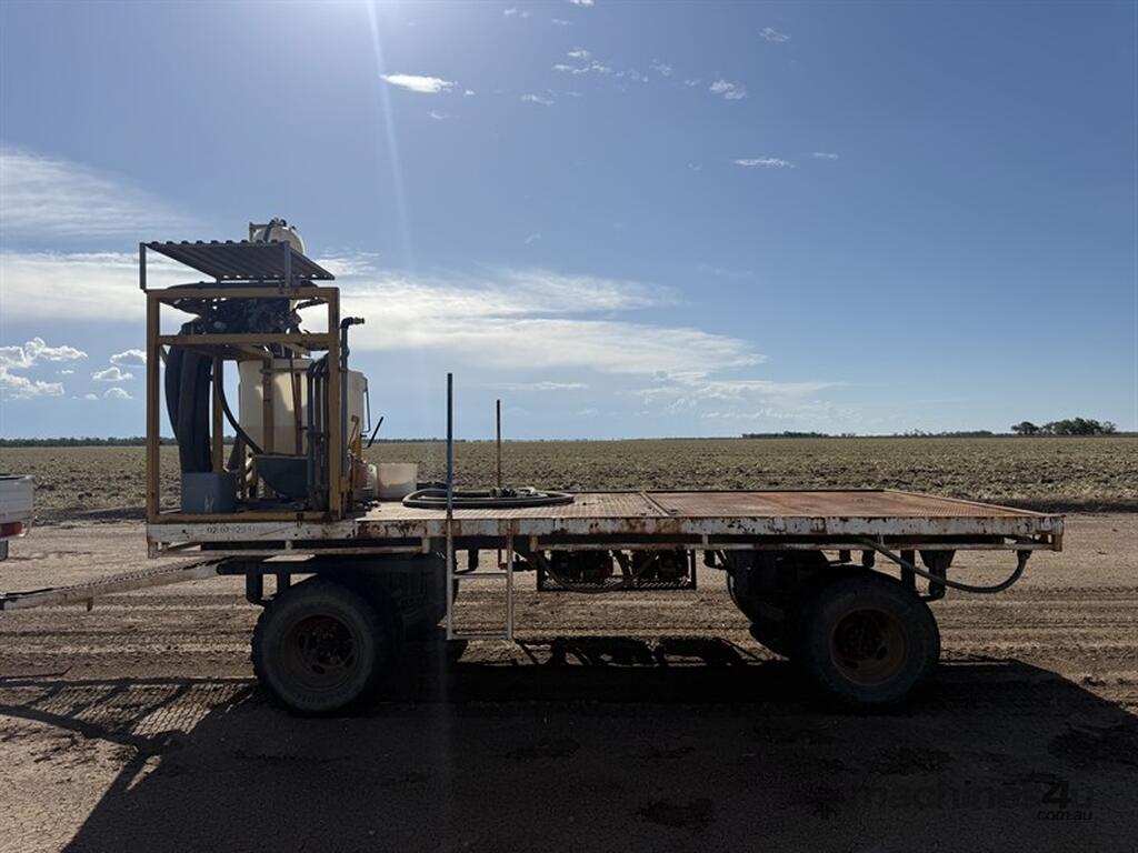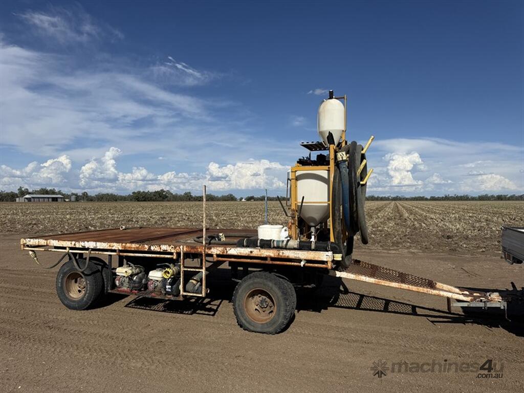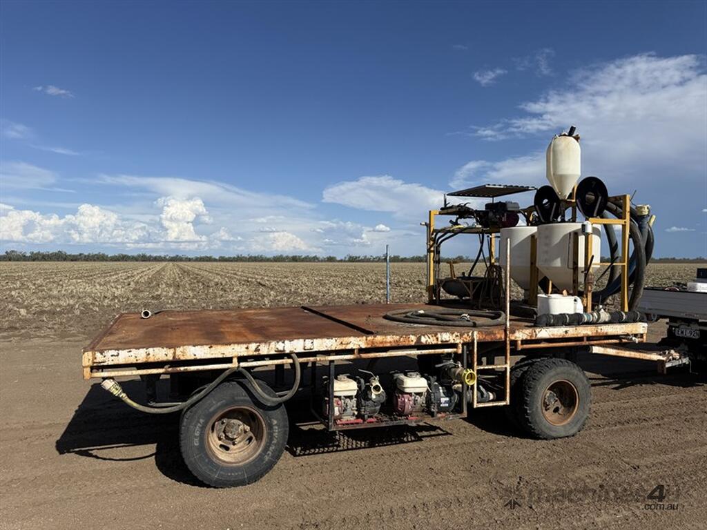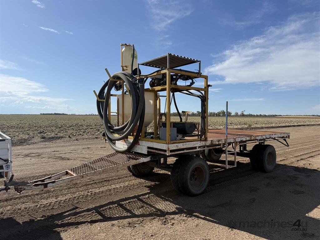 Chemical Trailer. Holds 4 x shuttles, chemical pump with vat system, 3" water pump with chemical suction from vats, 2" fresh water pump. Located near Rowena NSW, available at MRE Auctions online sale.