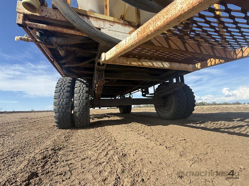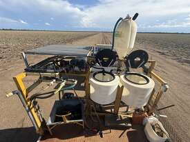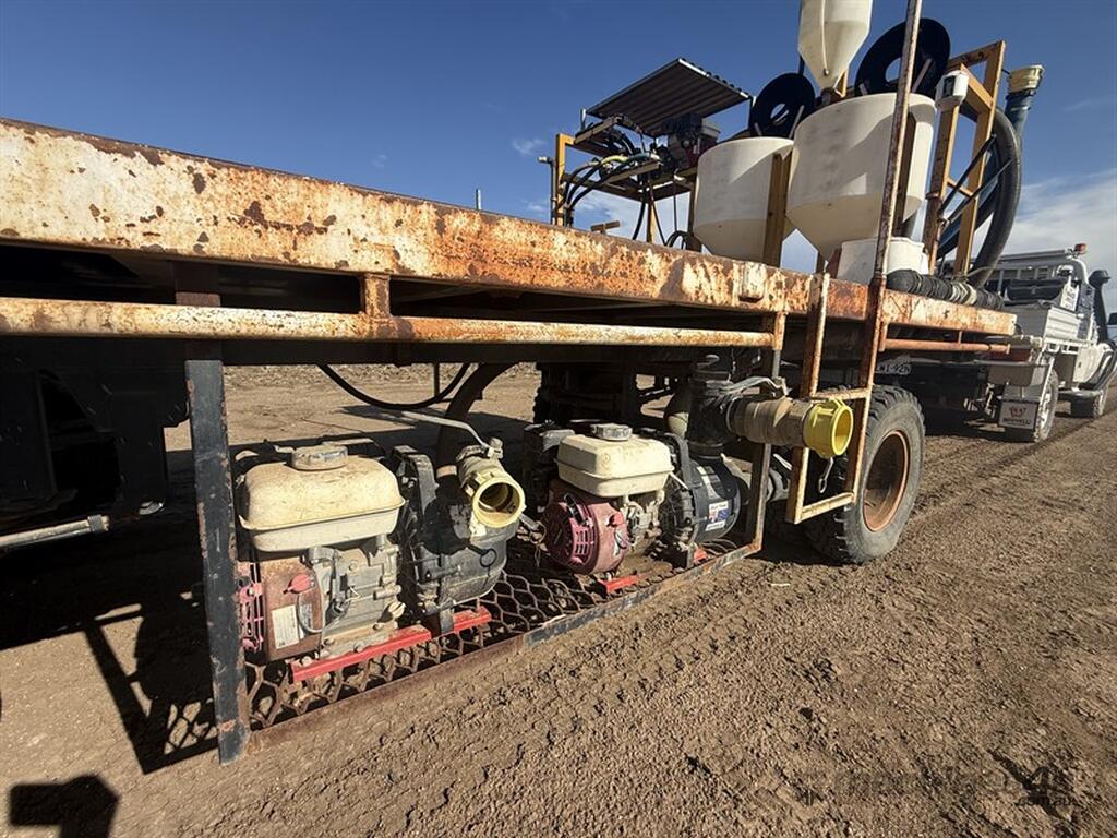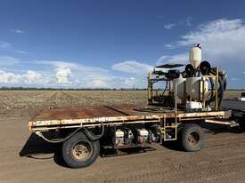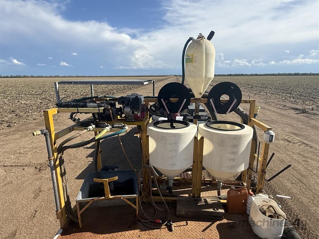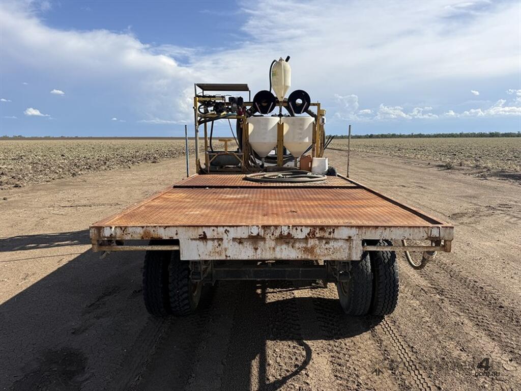 Chemical Trailer. Holds 4 x shuttles, chemical pump with vat system, 3" water pump with chemical suction from vats, 2" fresh water pump. Located near Rowena NSW, available at MRE Auctions online sale.