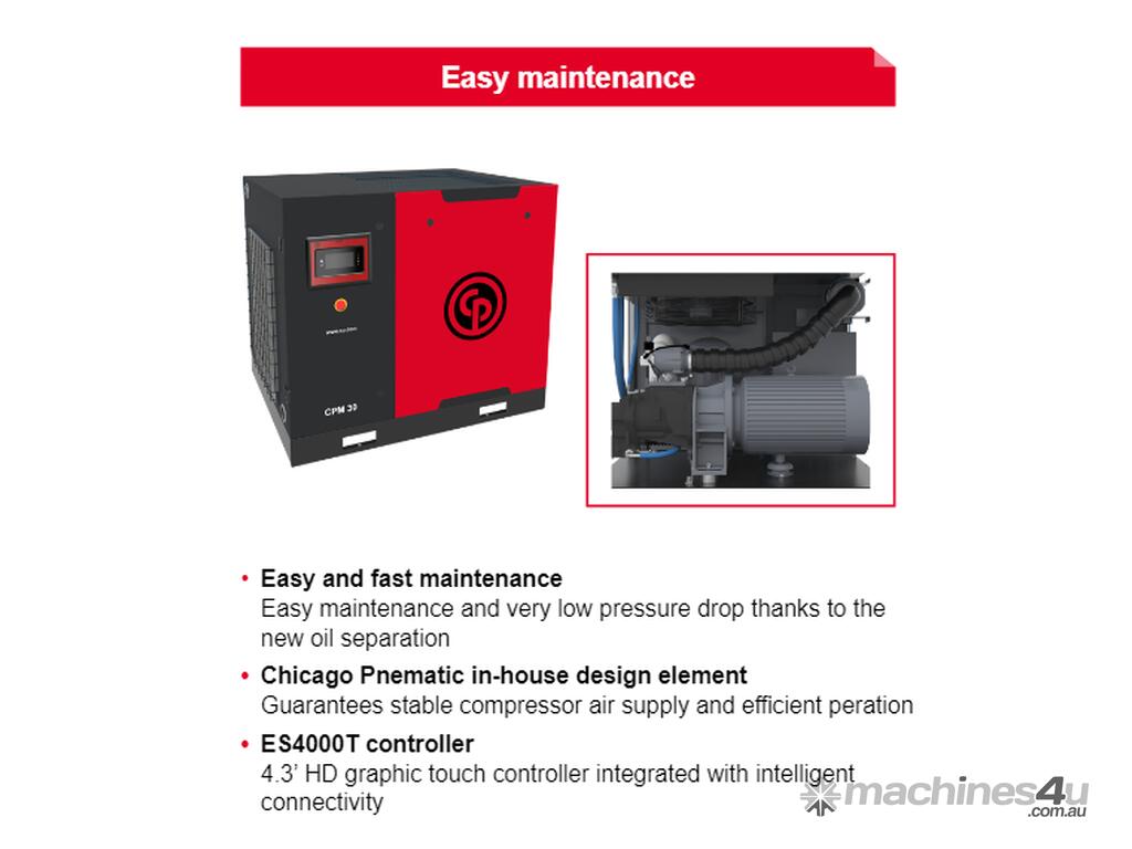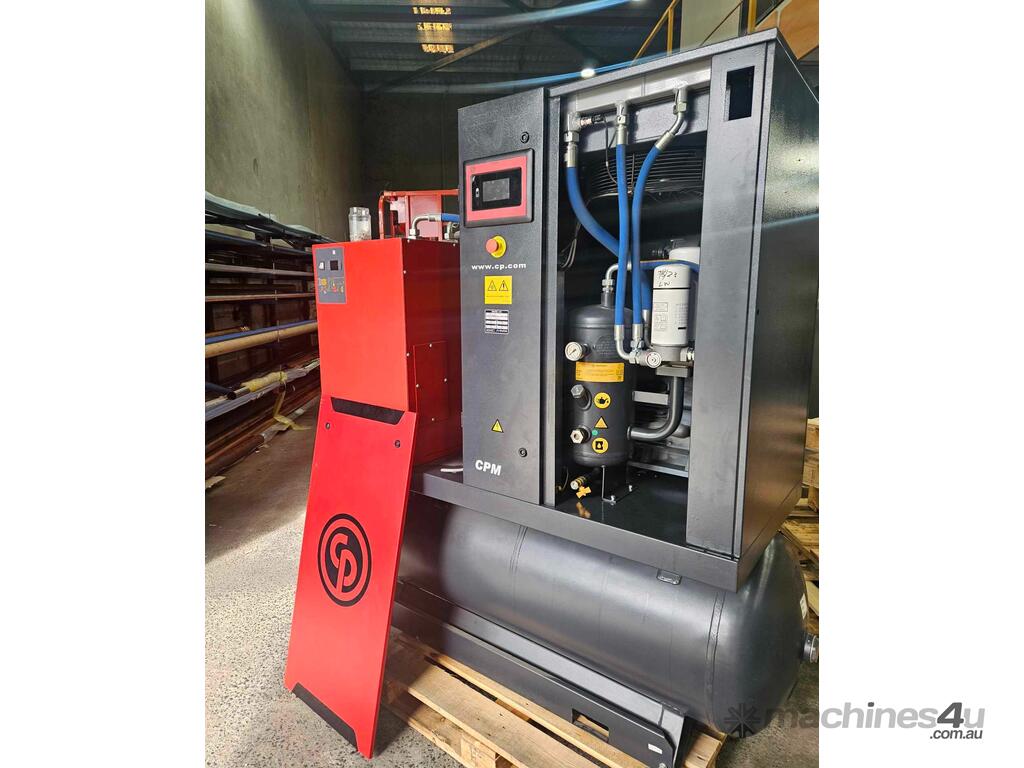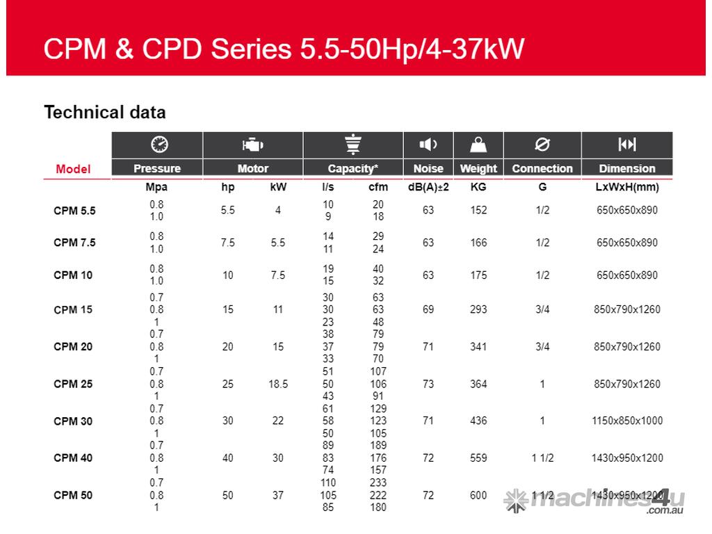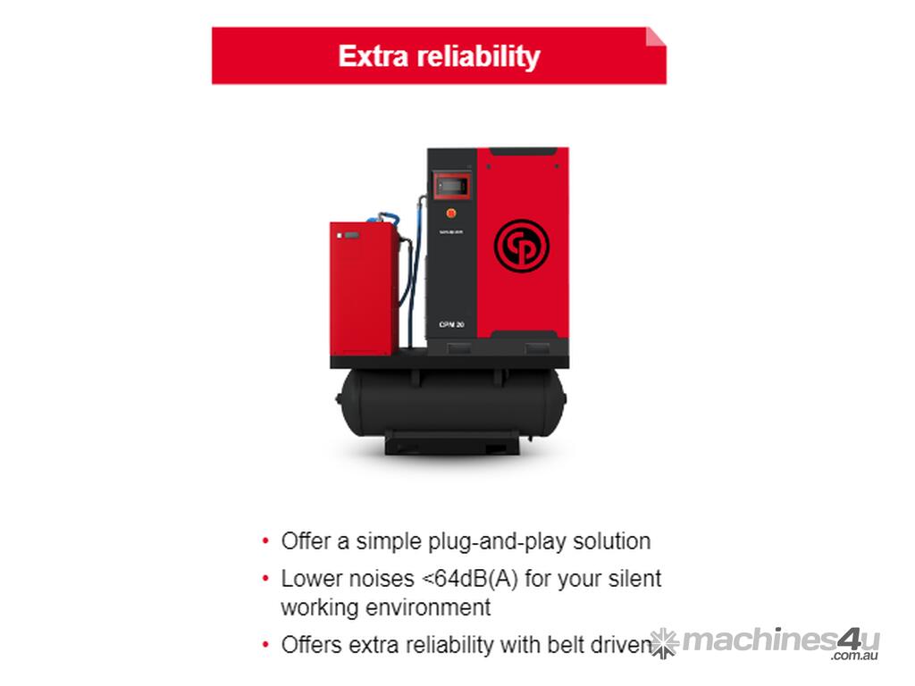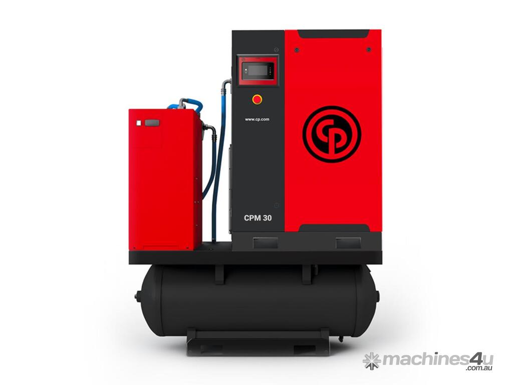 CPM Series Air Compressors are easy to use, efficient and reliable. The CPM Series meets the compressed air demands of manufacturing facilities, tire shops, paint shops, car dealers, maintenance shops, etc. Easy to use and quiet by design, the CPM can be installed almost anywhere in the workshop, without disturbing your working environment. Tank mounted with Air Dryer. Gear driven, no drive belts.