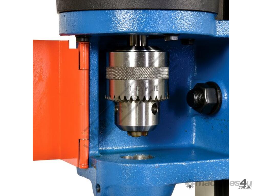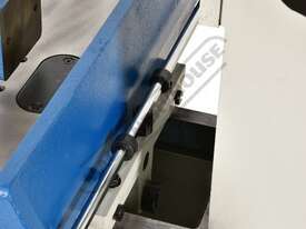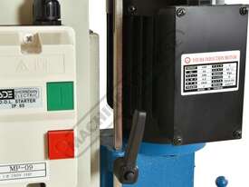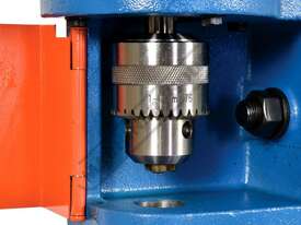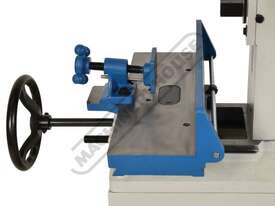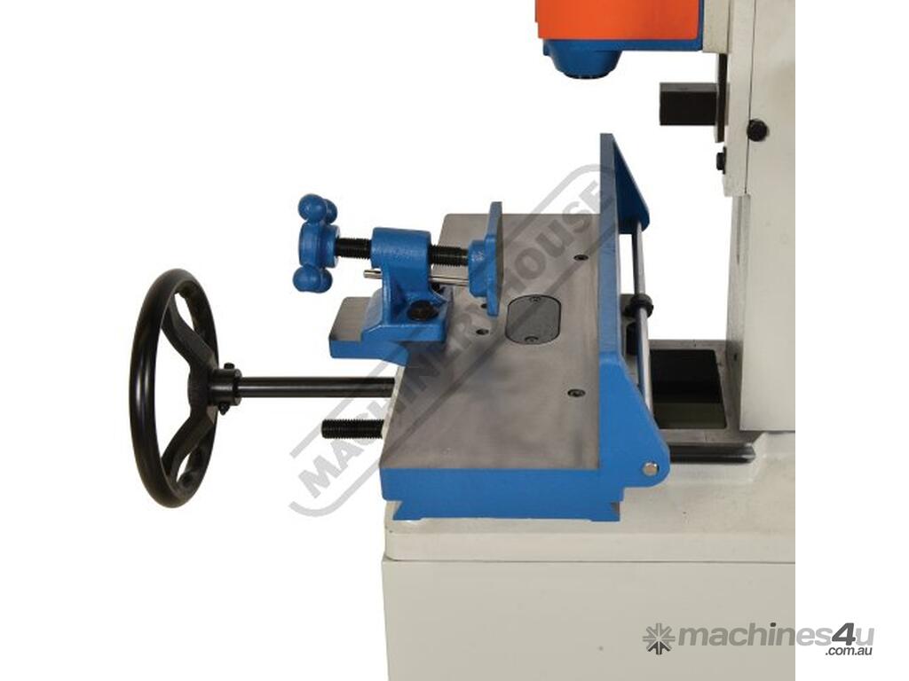 This heavy-duty chisel morticer handles up to 25mm in softwood, featuring a cast iron frame and a fabricated steel stand. A single handwheel controls both longitudinal and lateral table movements, eliminating table "skewing," a common issue in other models. The material clamp adjusts for various workpiece widths, while the multi-position down-feed lever ensures comfortable operation with optimal leverage.