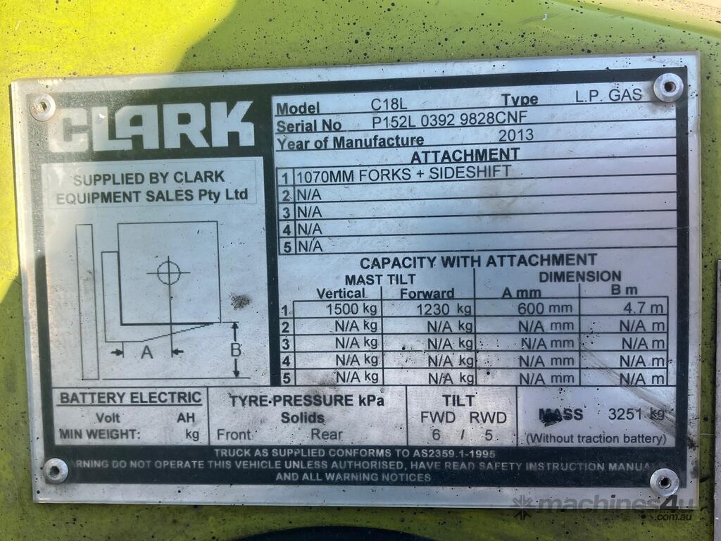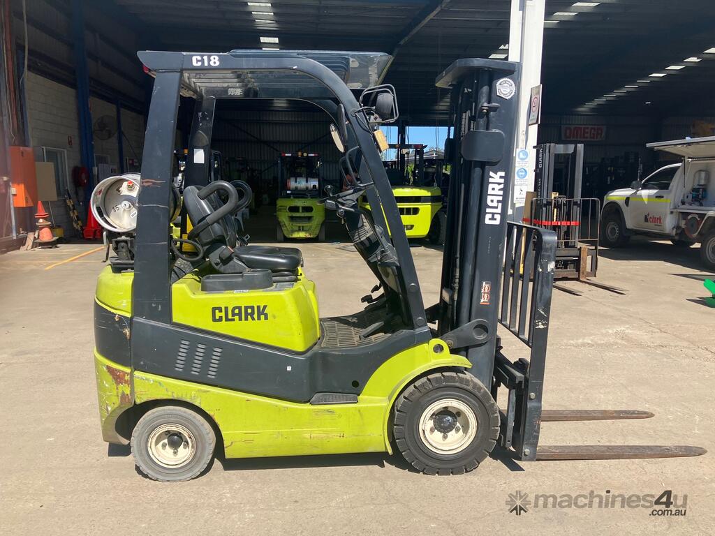 USED ... Clark C18L ... 1.8 Tonne Gas Forklift ... 1800kg Load Capacity ... 4800mm Lift Height ... 1070mm Fork Tynes ... Side Shift ... Solid Tyres ... Compact and Low Hours