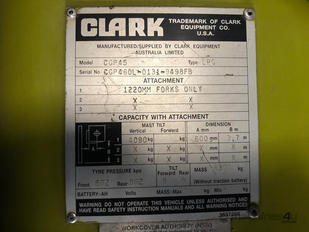 USED # Clark CGP45L # 4,5 Tonne Gas Forklift # 4500kg Load Capacity # 3700mm Lift Height # 1220mm Fork Tynes # QUICK & EASY FINANCE AVAILABLE # Weekly Rental Rate $220 + GST