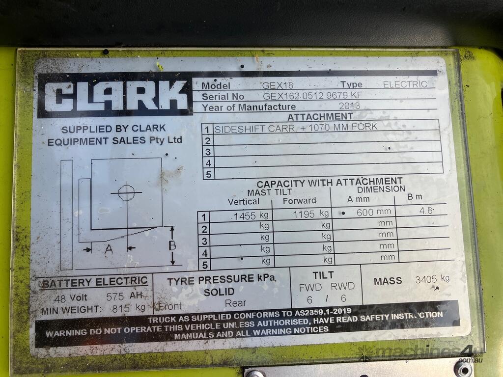 USED # Clark GEX18 # 1,8 Tonne Electric Forklift # 1800kg Lift Capacity # 4800mm Lift Height # Side Shift # 1070mm Fork Tynes # QUICK & EASY FINANCE AVAILABLE