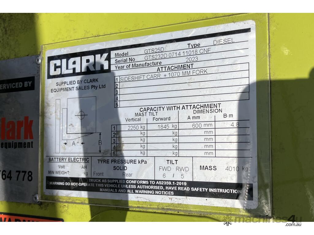 USED # Clark GTS25D # 2,5 Tonne Diesel Forklift # 2500kg Load Capacity # 4800mm Lift Height # 1070mm Fork Tynes # Side Shift # QUICK & EASY FINANCE AVAILABLE