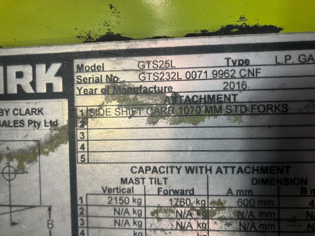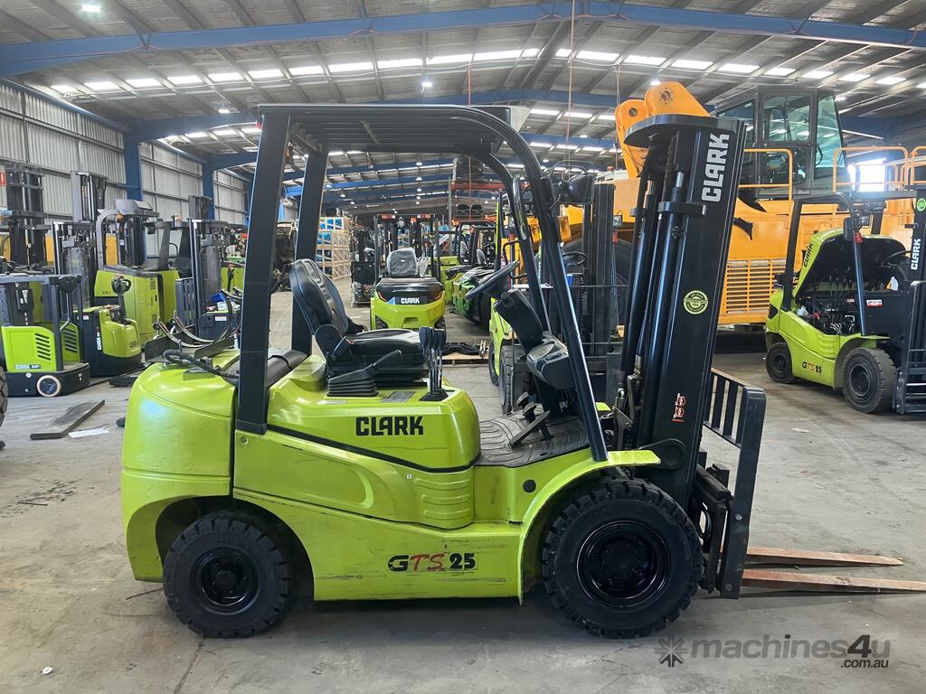 USED ... Clark GTS25L ... 2.5 Tonne Gas Forklift ... 2500kg Load Capacity ... 4800mm Lift Height ... 1070mm Fork Tynes ... Side Shift ... 4th Lever Ready for Attachments ... Solid Tyres Near New