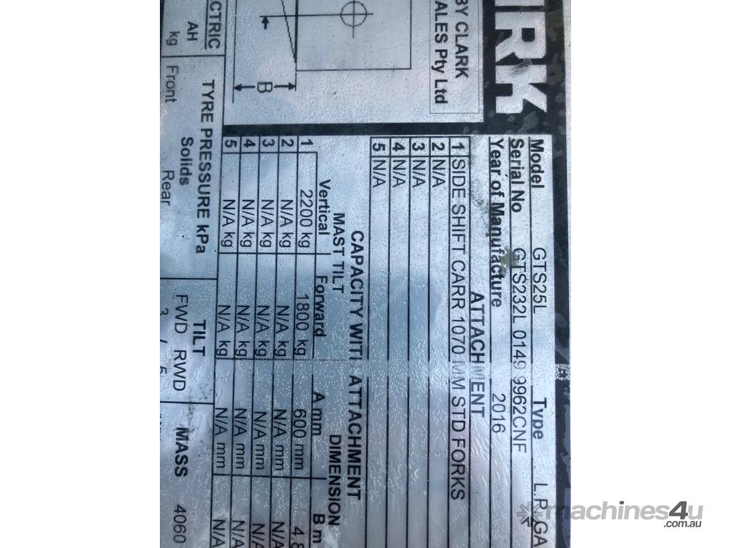 USED ... Clark GTS25L ... 2.5 Tonne Gas Forklift ... 2500kg Load Capacity ... 4800mm Lift Height ... 1070mm Fork Tynes ... Side Shift ... Solid Tyres