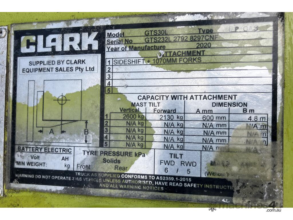 USED # Clark GTS30L # 3 Tonne Gas Forklift # 3000kg Load Capacity # 4800mm Lift Height # 1070mm Fork Tynes # Side Shift # QUICK & EASY FINANCE AVAILABLE