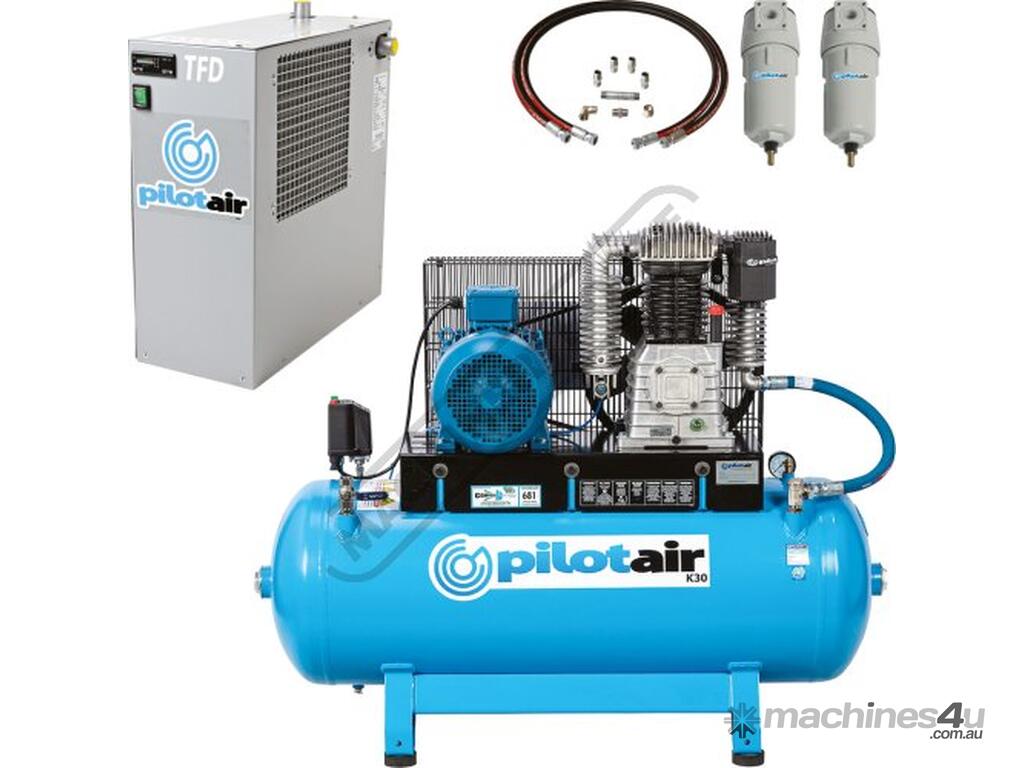 PILOT AIR COMPRESSORS Classic Industrial Series 3 Phase Reciprocating - Pilot Air Compressor & TFD-10 Refrigerated Air Dryer Package Deal K30 200 Litre / 7.5hp 30.8cfm / 871.8lpm Piston Displacement