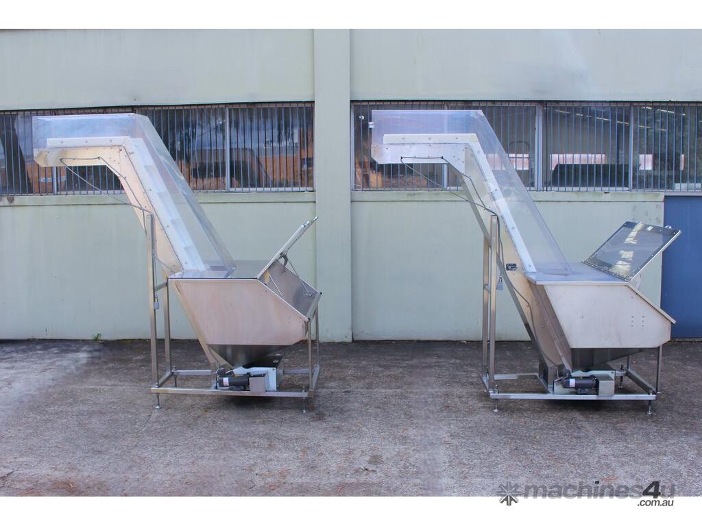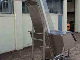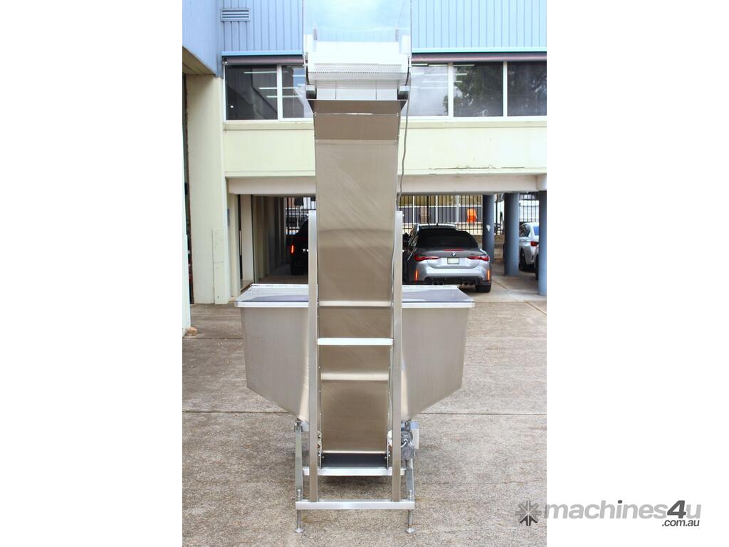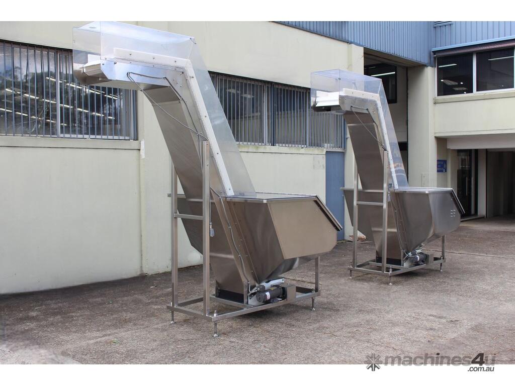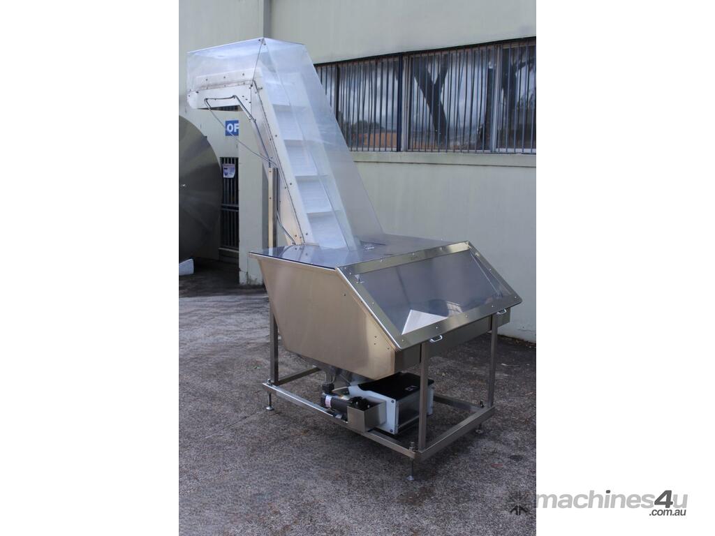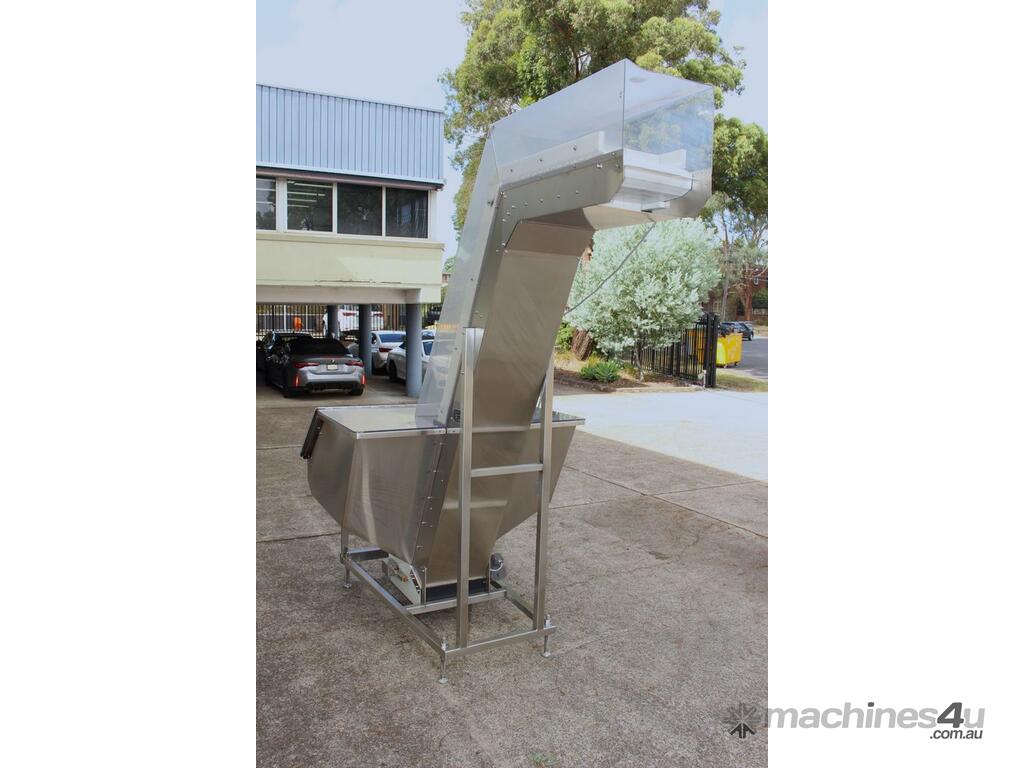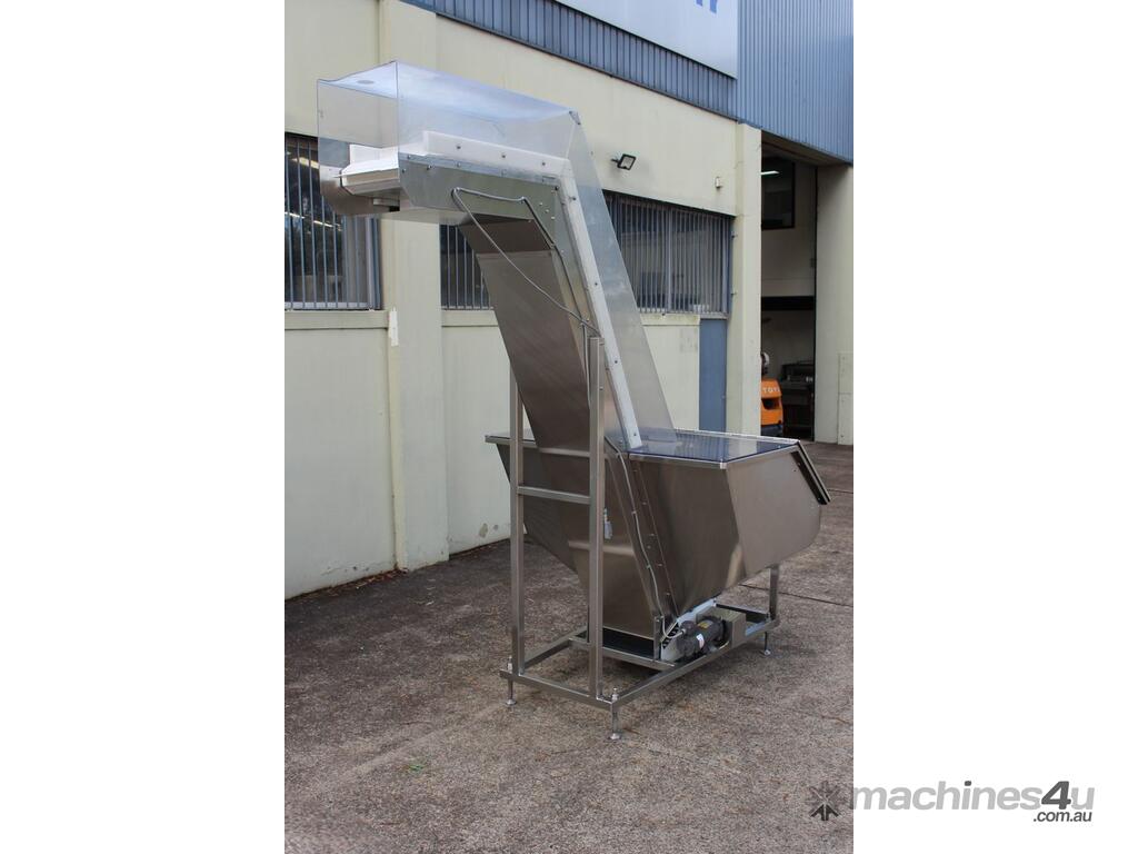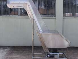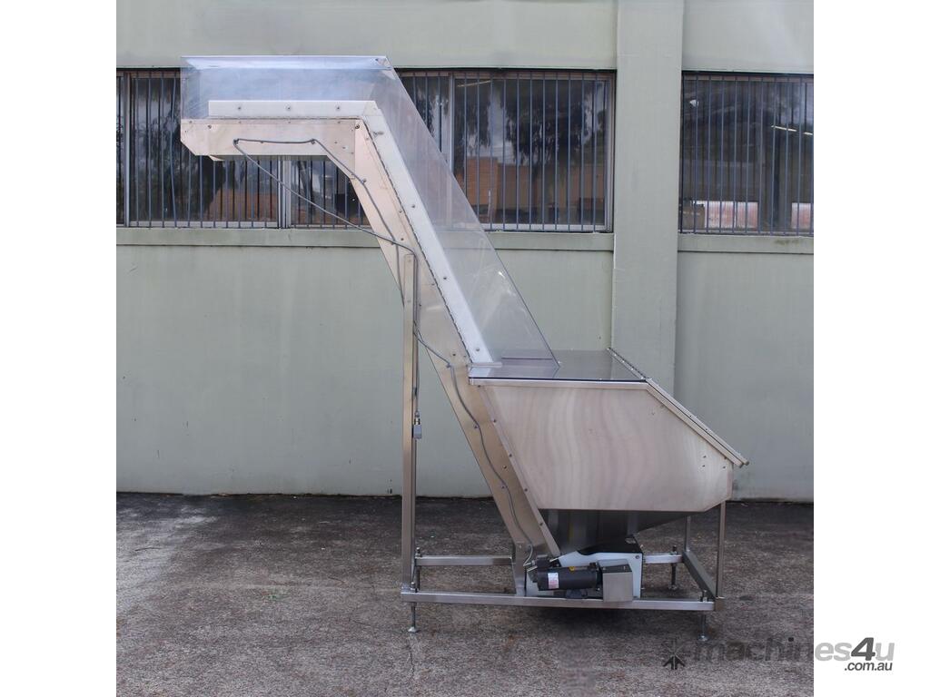 Cleated Belt Elevator, all stainless steel frame design, belt dimensions: 400mm wide x 300mm spaced between cleats x 75mm deep, discharge at a height of 2700mm, totally enclosed hopper 1470mm wide x 1030mm long x 900mm deep with Perspex hinged lid, mounted on a stainless steel mobile frame, driven by 90VDC electric geared motor with 240V AC single phase variable speed controller, Perspex covered conveyor, overall dimensions (L x W x H): 2800mm x 1530mm x 2700mm