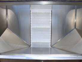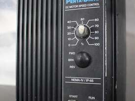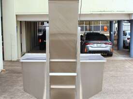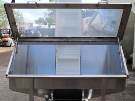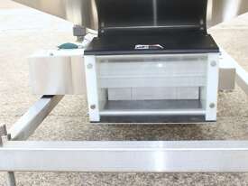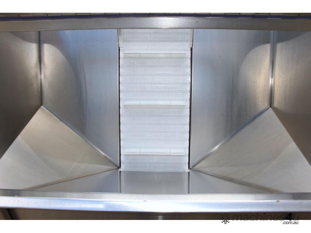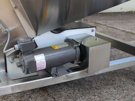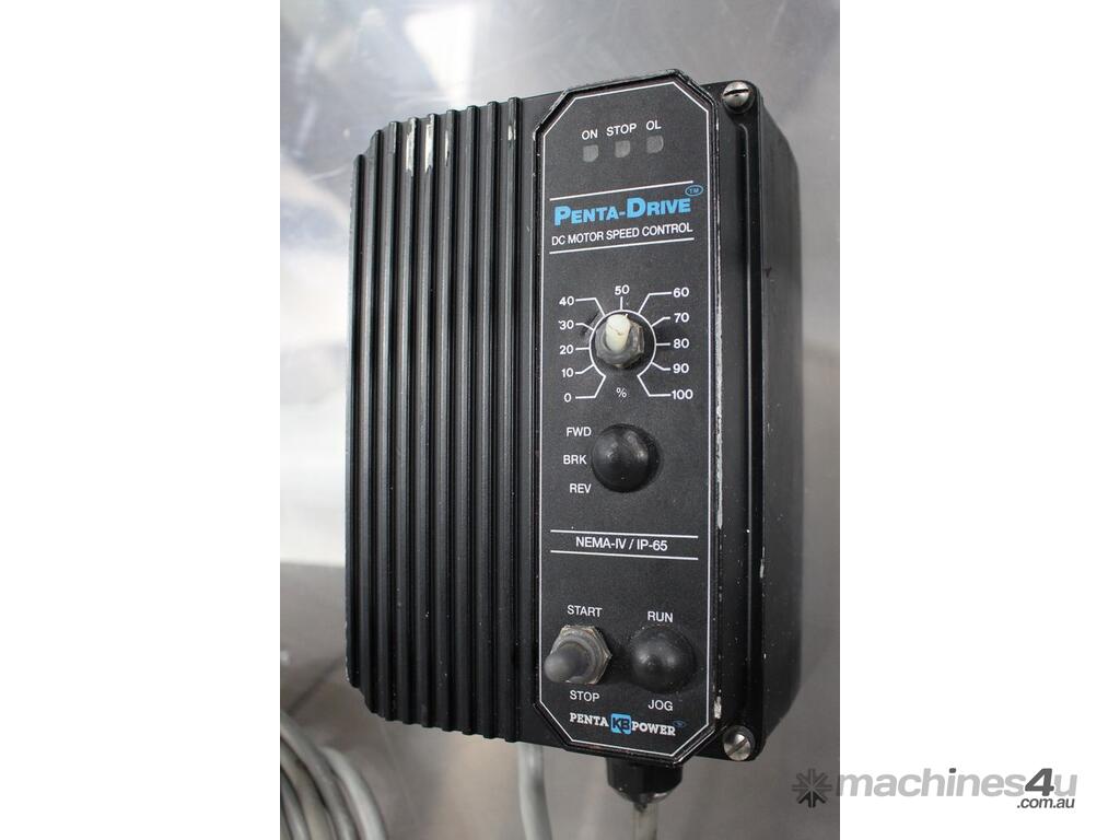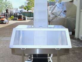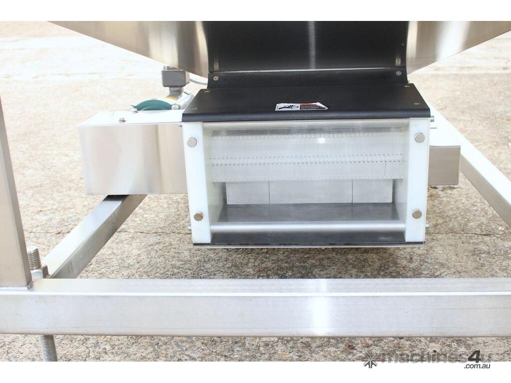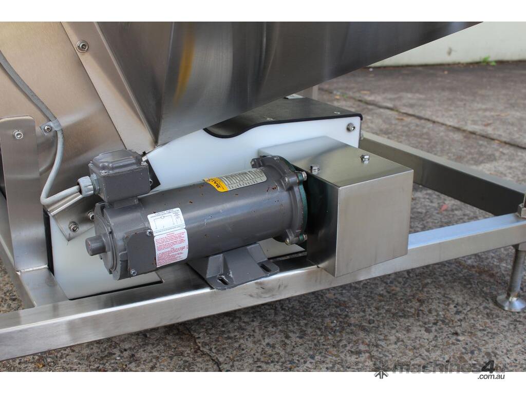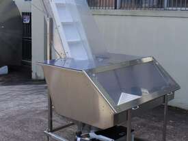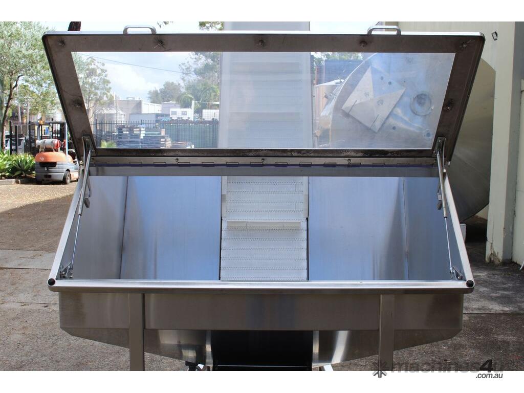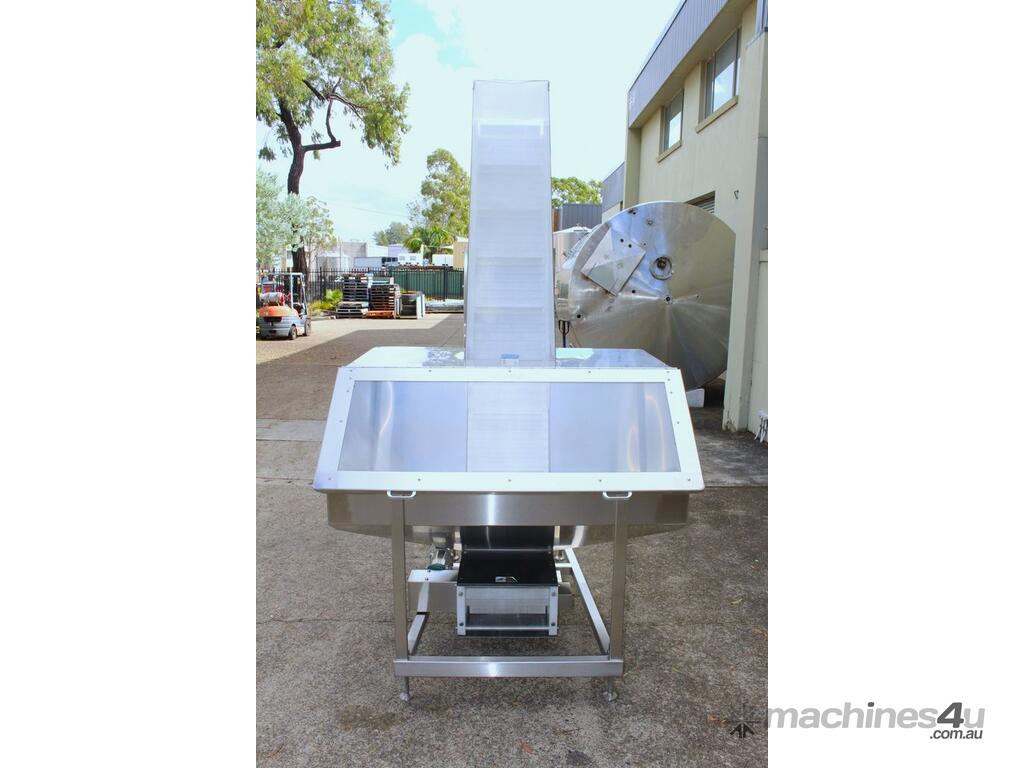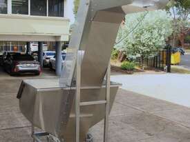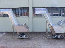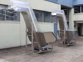 Cleated Belt Elevator, all stainless steel frame design, belt dimensions: 400mm wide x 300mm spaced between cleats x 75mm deep, discharge at a height of 2700mm, totally enclosed hopper 1470mm wide x 1030mm long x 900mm deep with Perspex hinged lid, mounted on a stainless steel mobile frame, driven by 90VDC electric geared motor with 240V AC single phase variable speed controller, Perspex covered conveyor, overall dimensions (L x W x H): 2800mm x 1530mm x 2700mm