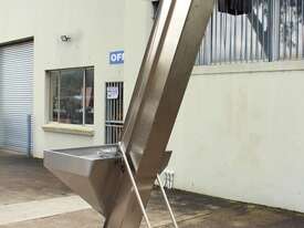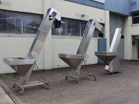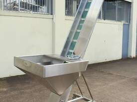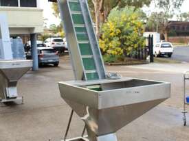 Elevator, complete stainless steel structure, with a 860mm x 770mm x 600mm hopper, feeding to a 200mm wide conveyor belt with 200mm long x 40mm deep cleated sections, completely covered with acrylic sheet, elevating to a height of 2470mm high, overall height 2900mm, mobile