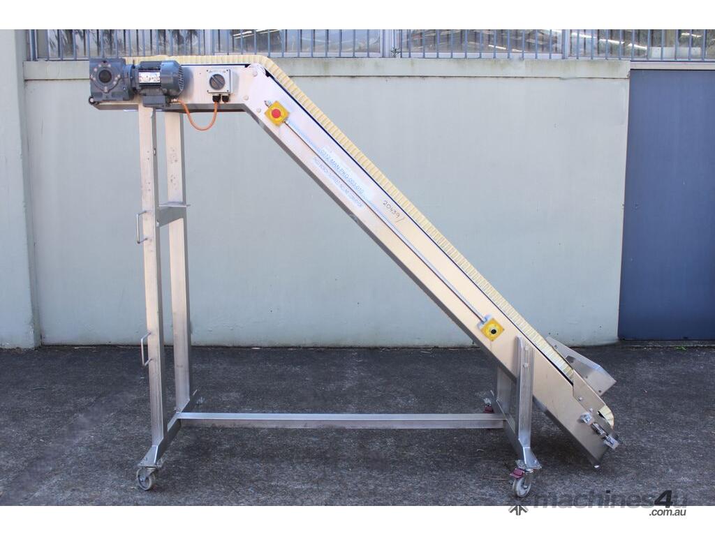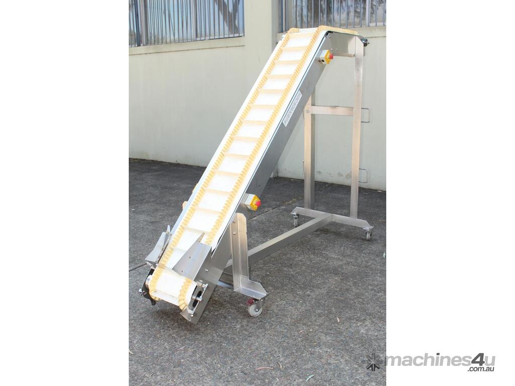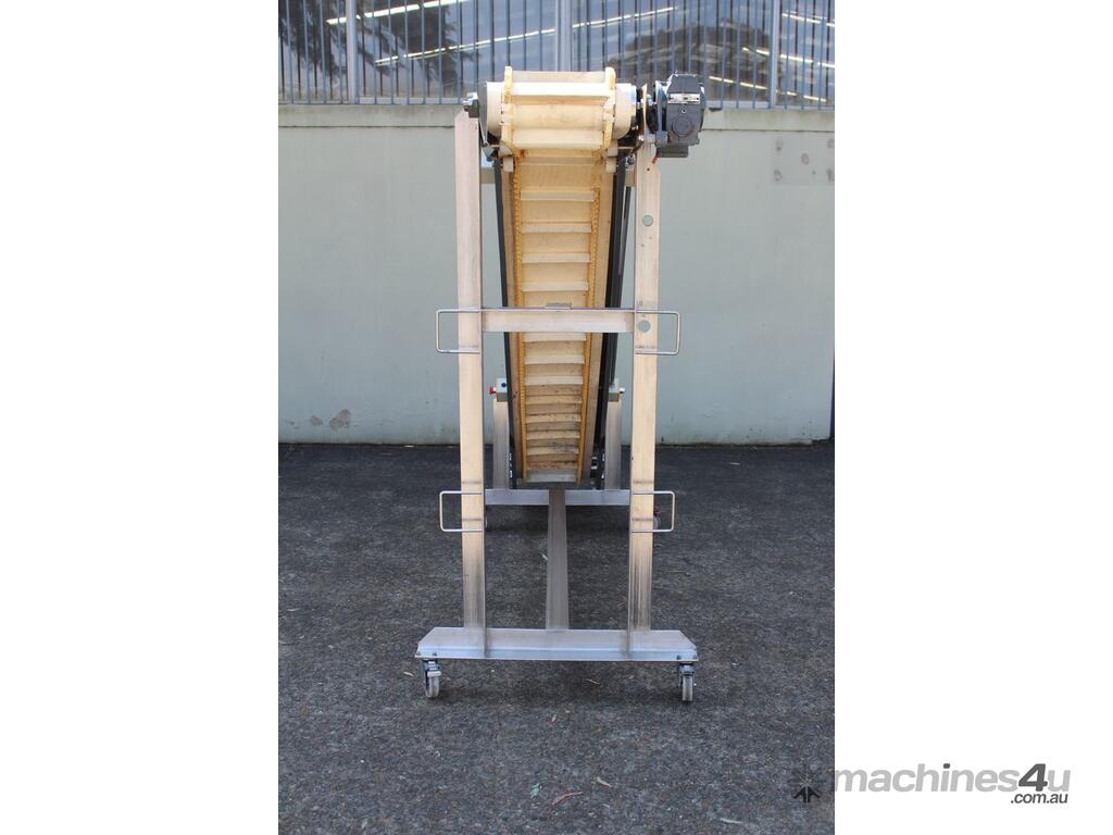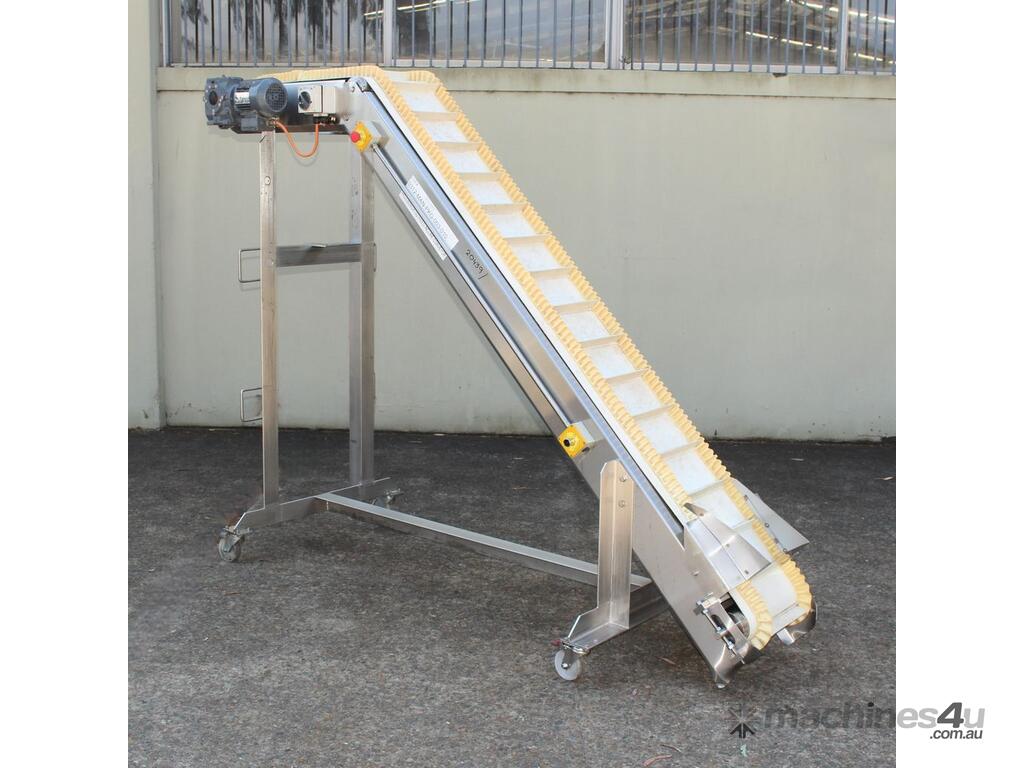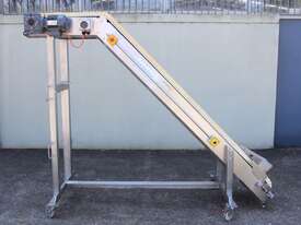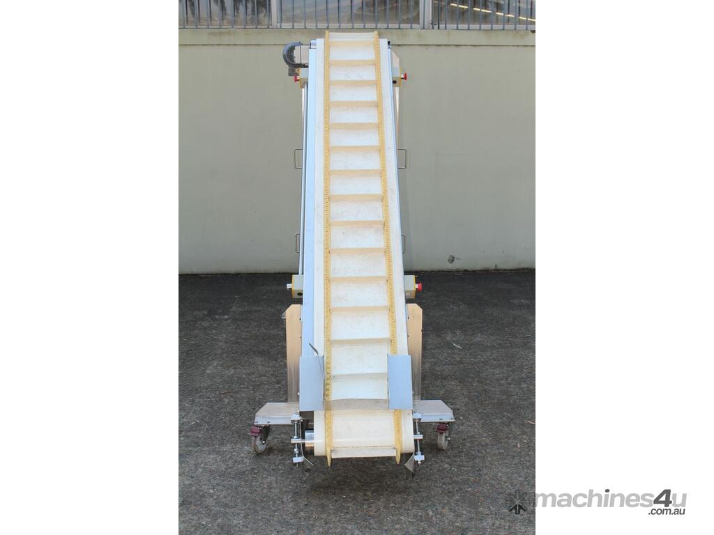 Cleated Belt Elevator, 250mm wide food grade belt with 150mm long and 40mm deep cleated sections, elevating to an overall height of 1800mm, overall length 3000mm, all stainless steel frame and driven by 3 phase 0.37kw motor, mobile