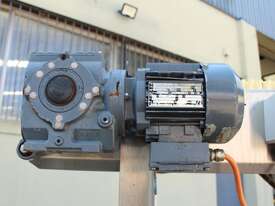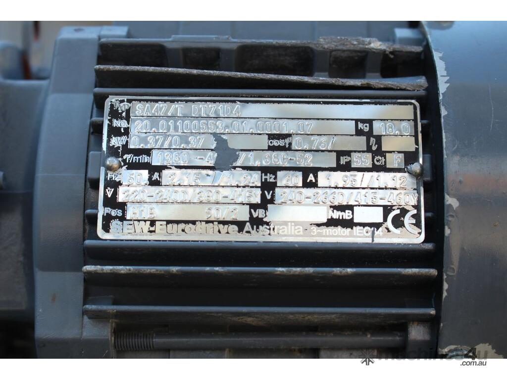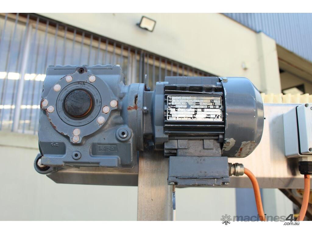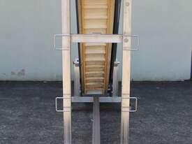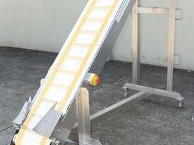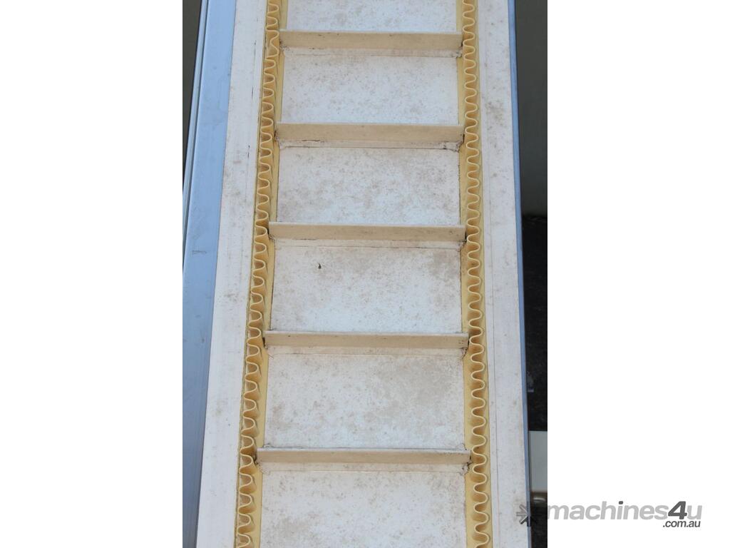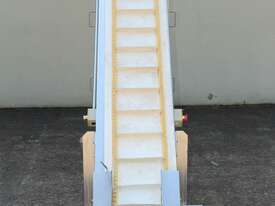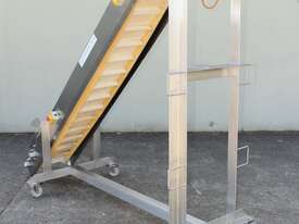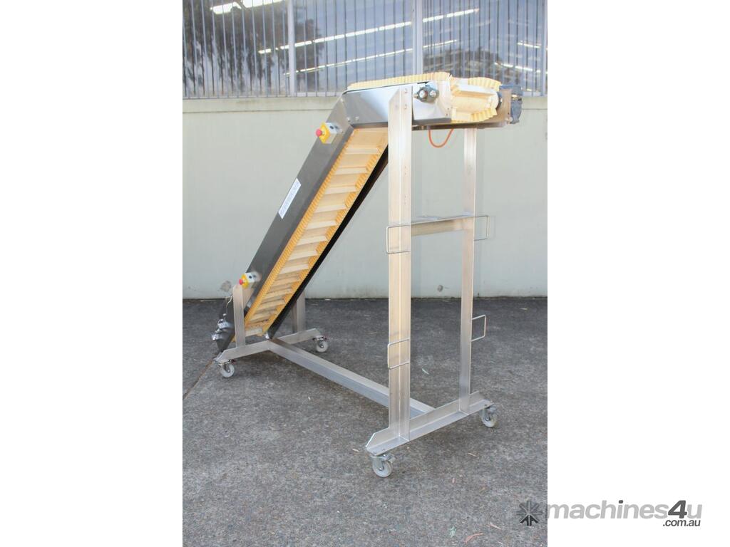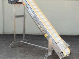 Cleated Belt Elevator, 250mm wide food grade belt with 150mm long and 40mm deep cleated sections, elevating to an overall height of 1800mm, overall length 3000mm, all stainless steel frame and driven by 3 phase 0.37kw motor, mobile