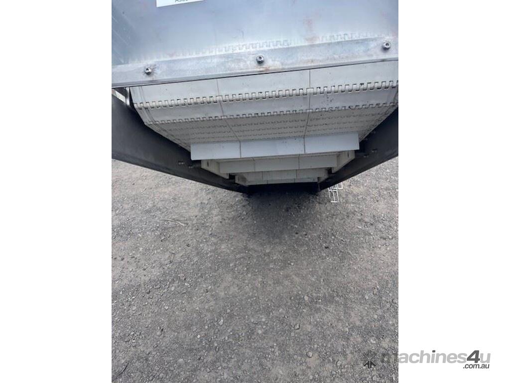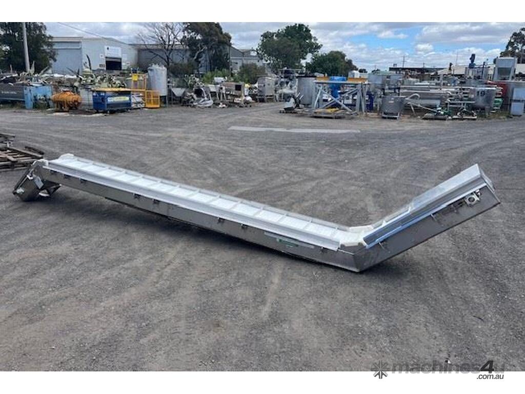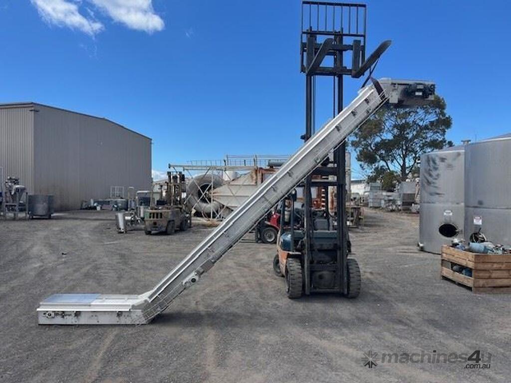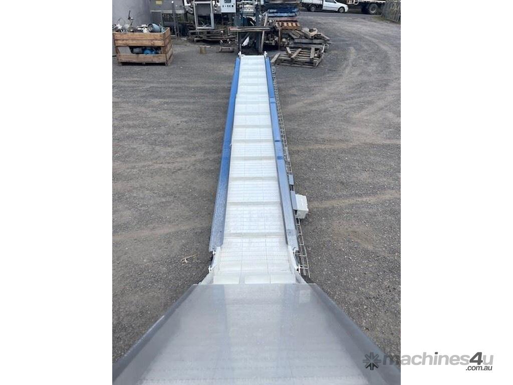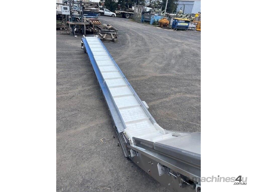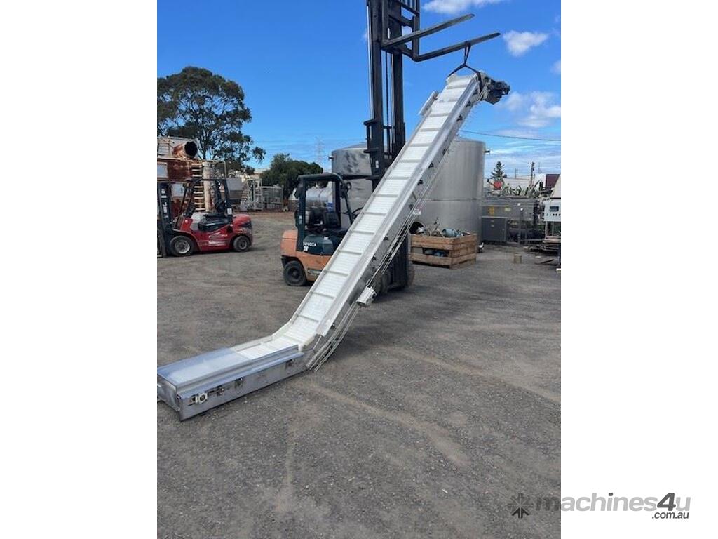Stainless steel cleated incline conveyor. Food grade plastic belt with 38mm high cleats. 400mm wide 1.2m long bottom section 4.3m long incline section 700mm long top section. Discharge height from top to ground is 3.3m 0.37kw SEW geared drive 415 volt 3 phase 76 rpm. Runs well.
