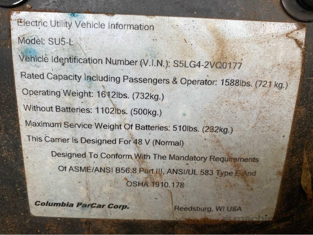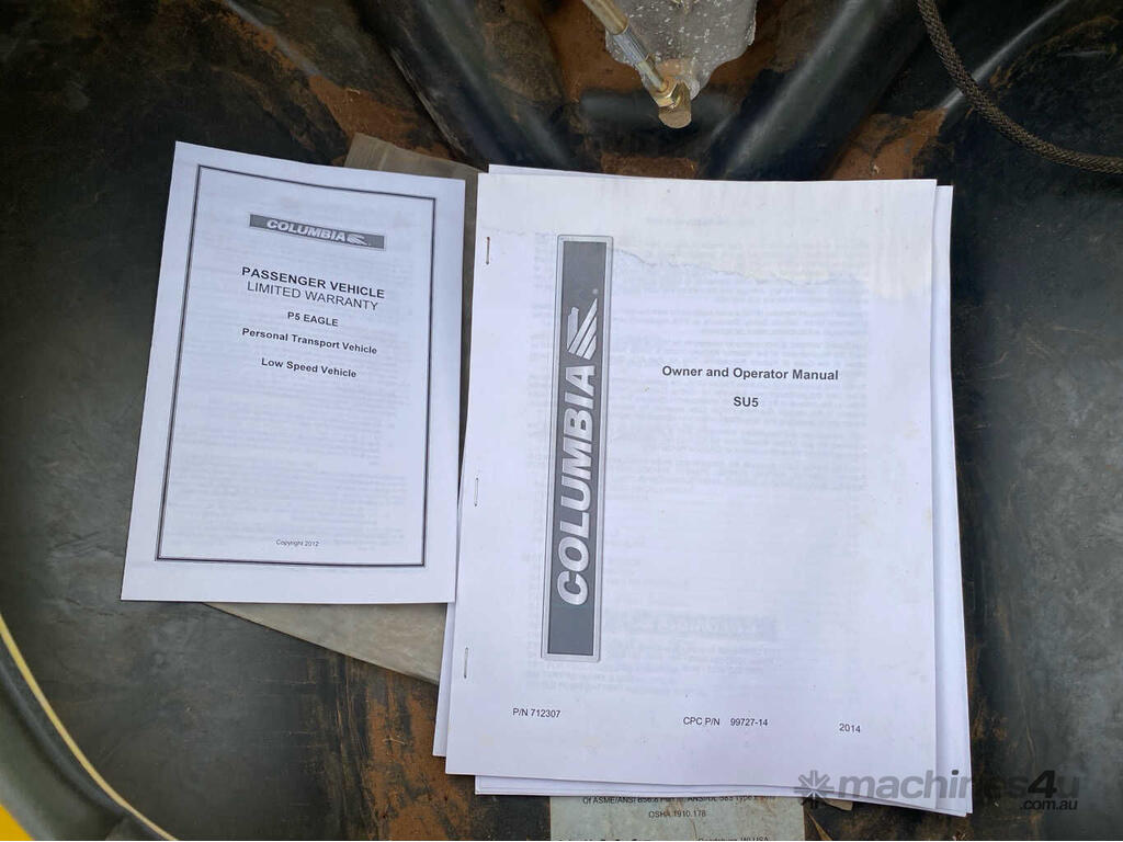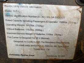 No C/P,Columbia,SU5-L,Electric Utility Vehicle,Electric,Odometer not visible,1367 (Hrs. Showing on Hour meter),Colour: Yellow,Unregistered,Serial No: S5LG4-2VQ0177,Sold with No Plates