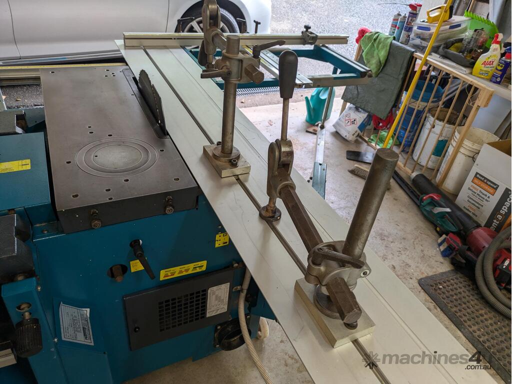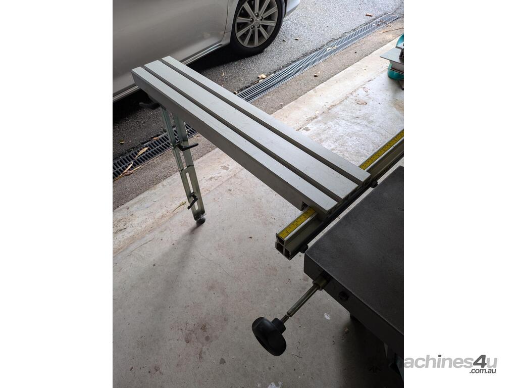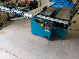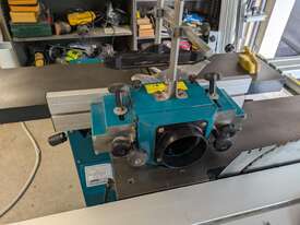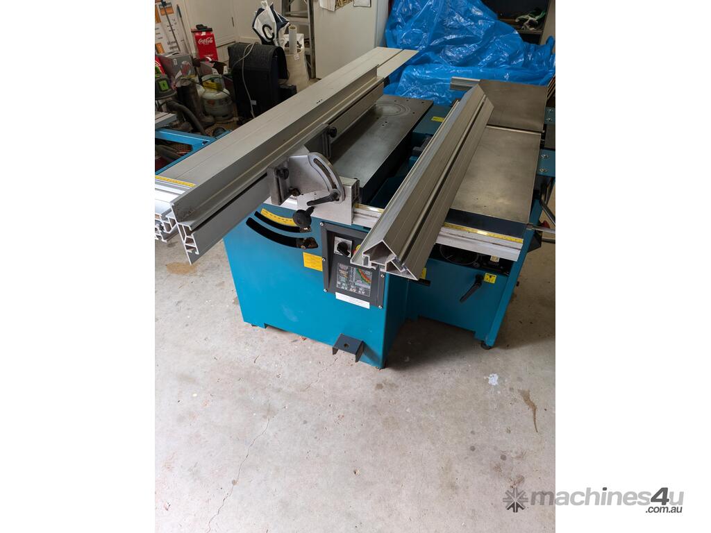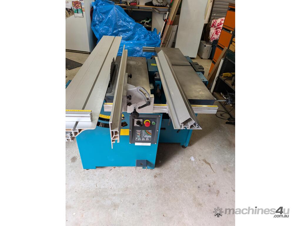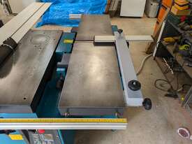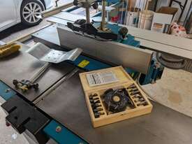 Combination table saw, thicknesser/jointer, with crosscutting outrigger, tie downs for saw table, extensions for infeed and outfeed tables for thicknesser/jointer, spindle moulder attachment, with multiple cutting shapes, rip and crosscut saw blades, and under sheet blade for eliminating tear out when cutting MDF or plywood panels. Two fences - one adjustable from 90 degrees, and the other set at 45 degrees. Both fit the saw table and the jointer/thicknesser