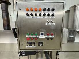 Stainless Steel Motorised Gas Fired Nut Oil Roaster, Comprising Raw Nut Load Hopper, Cleated Rubber Belt Elevating Conveyor, Vibratory Dust/Fragment Sieve Head, Stainless Steel Oil Bath Roasting Tunnel with Overhead Hood and Extraction Ducts to Atmosphere, Mesh Belt Pass Through Conveyor, Take Out Slide with Overhead Salt/Flavouring Head, Rotary Mixing Drum and Stainless Steel Mesh Belt Elevating Outfeed Conveyor, Twin Stainless Steel Oil Storage Drums on Stand each Approx 300 Litre, Control to 415V 3 Phase Electric Motor and Switch and Stainless Steel Mobile Nut Collection Bench