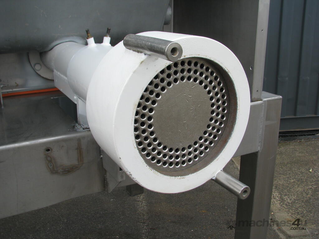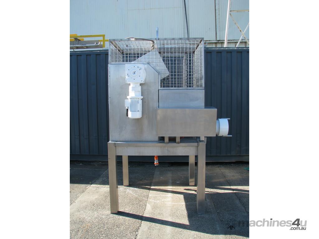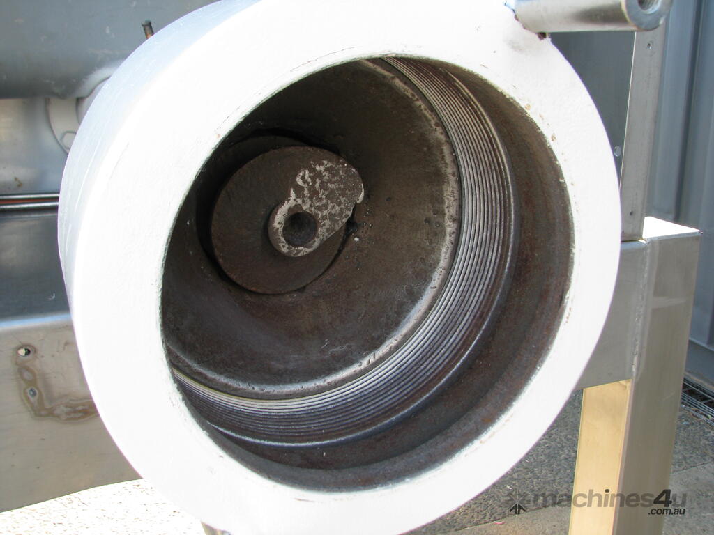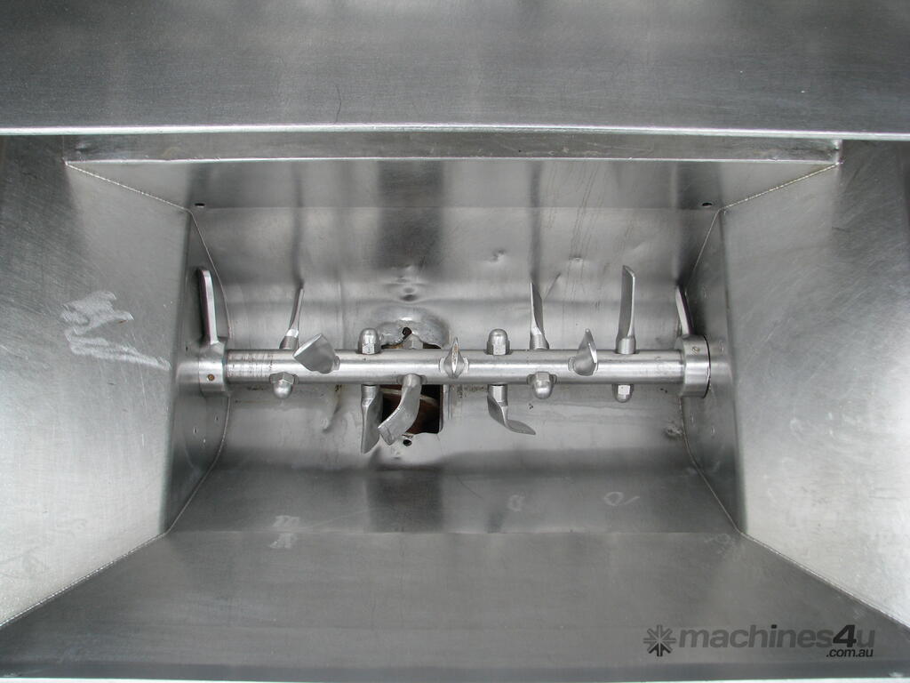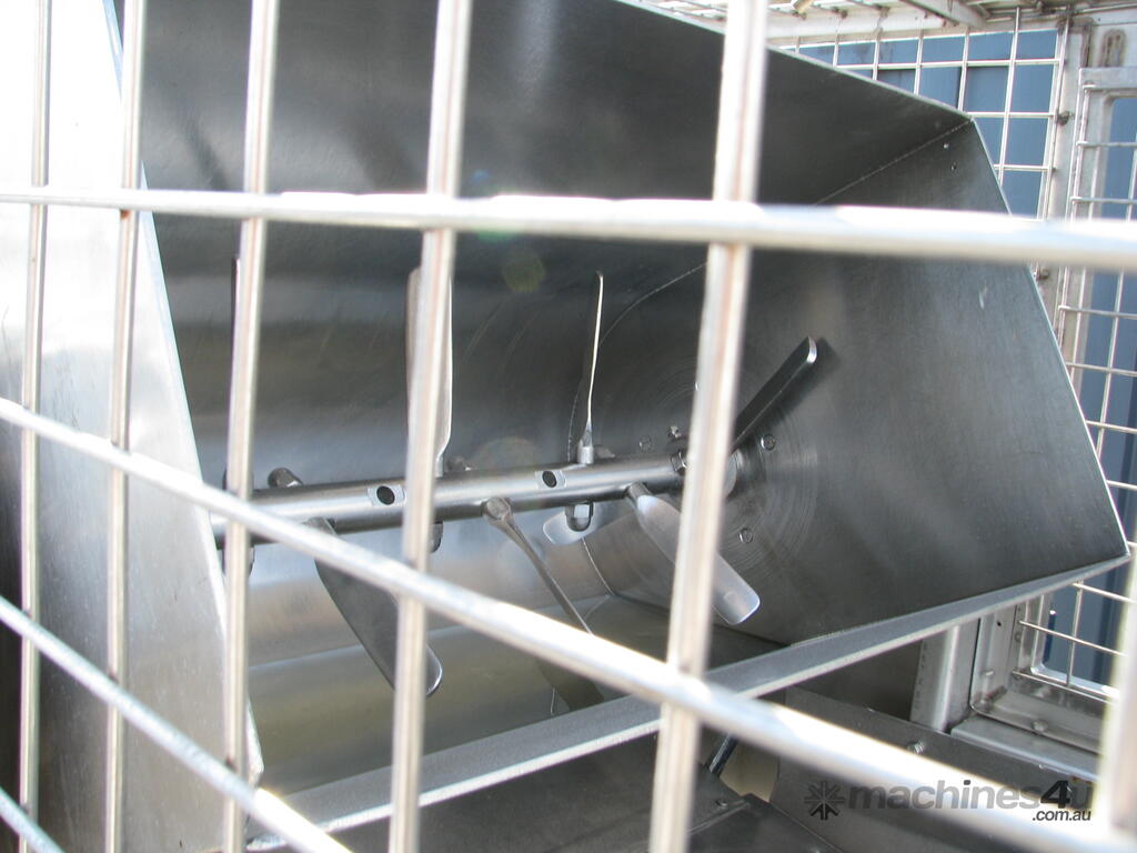 The hopper also has a mixer/agitator to keep the product's consistency while it is feeding into the screw extruder.