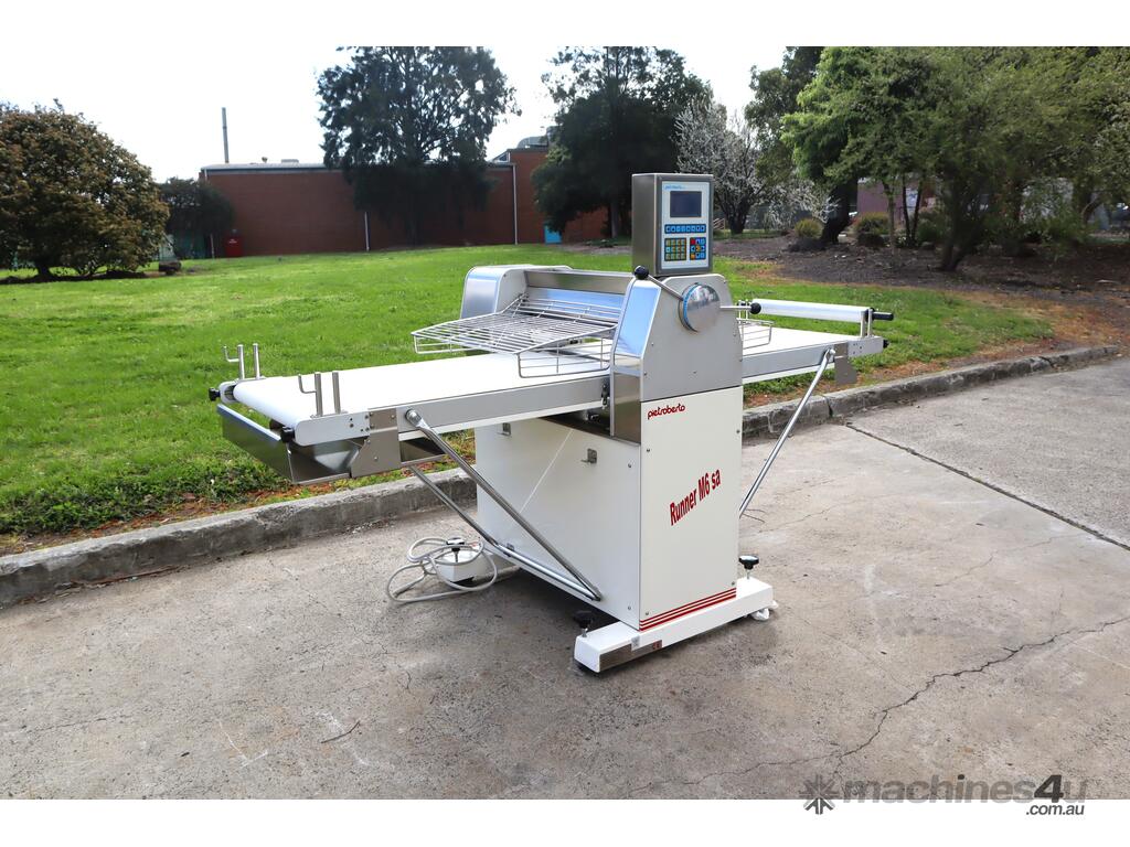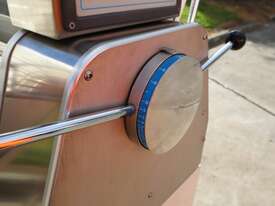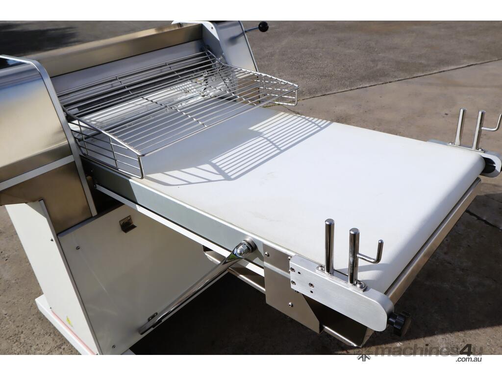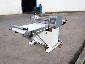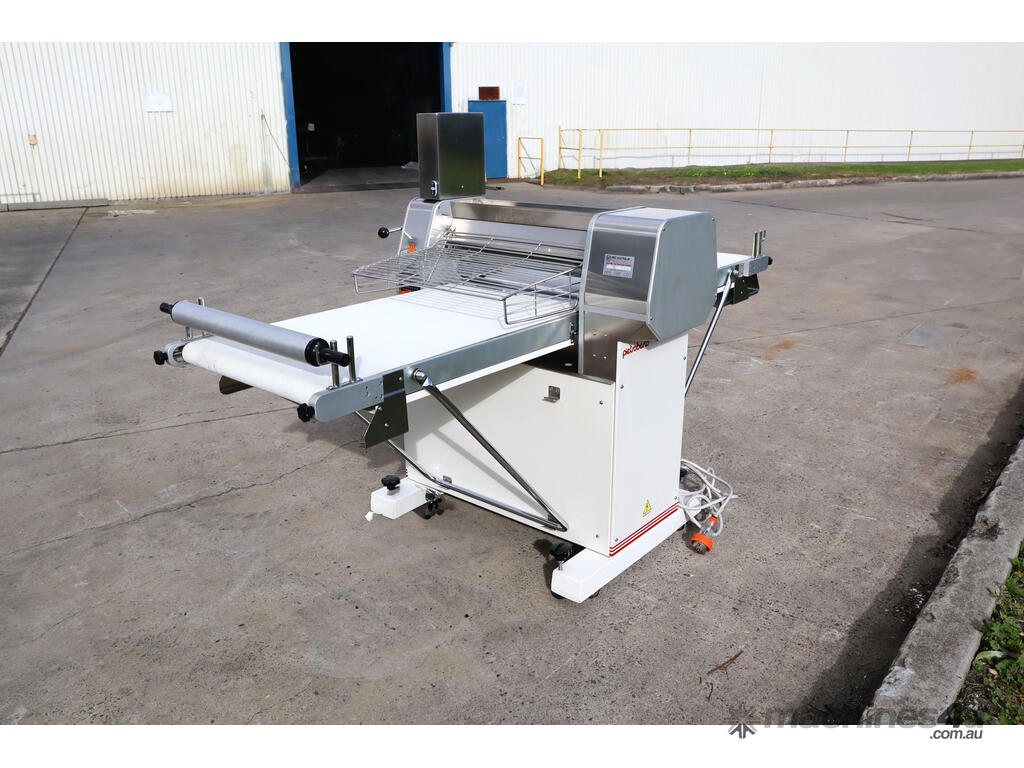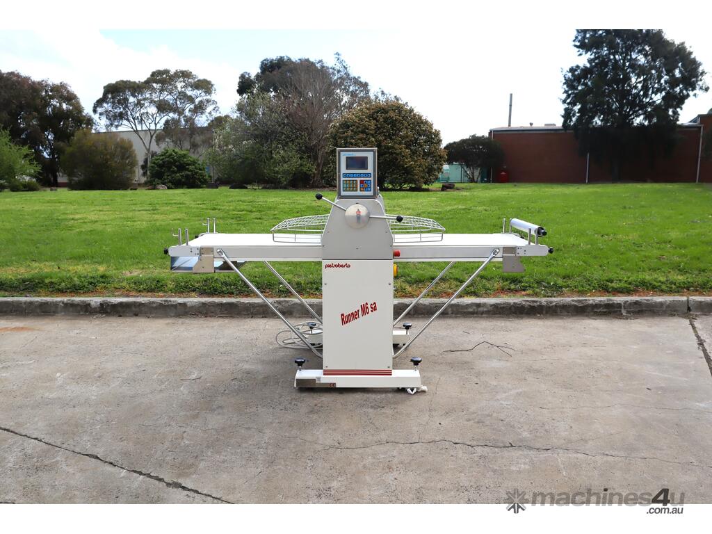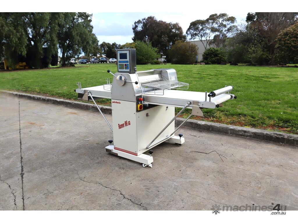 Italian built semi-automatic dough sheeter designed for accurate and repeatable lamination of pastry, pizza, and bakery doughs etc. The Runner M6 SA features a programmable digital control panel for belt direction, roller gap, and automatic cycle sequencing. Dual-speed operation provides precise control for progressive reduction, while the 0.2 – 60 mm roller adjustment range delivers uniform sheet thickness. Built in 2008, this model combines industrial reliability with easy sanitation and safe, ergonomic operation.