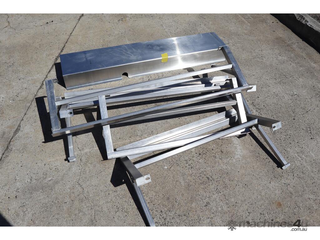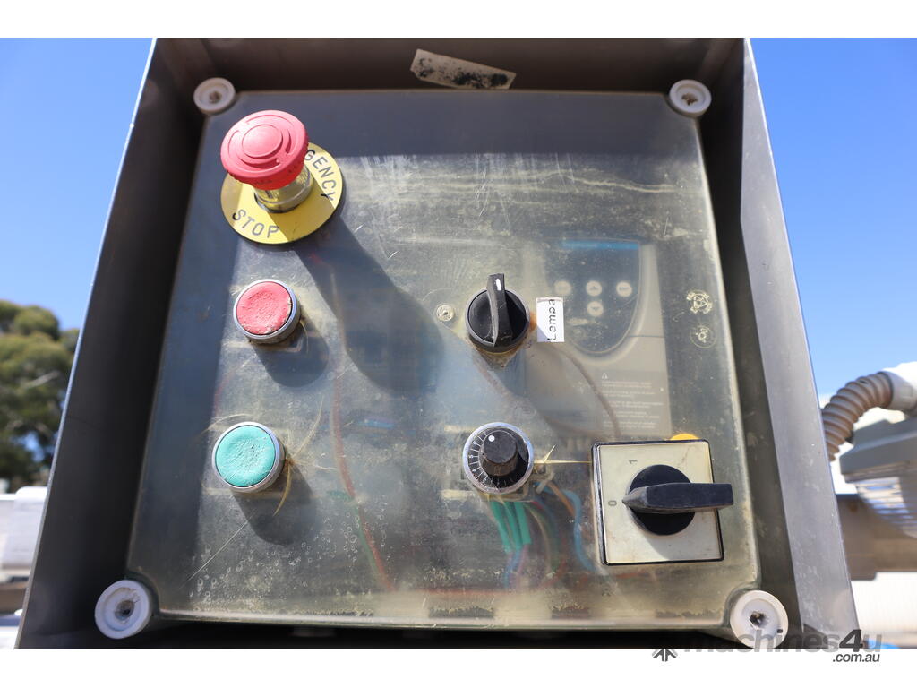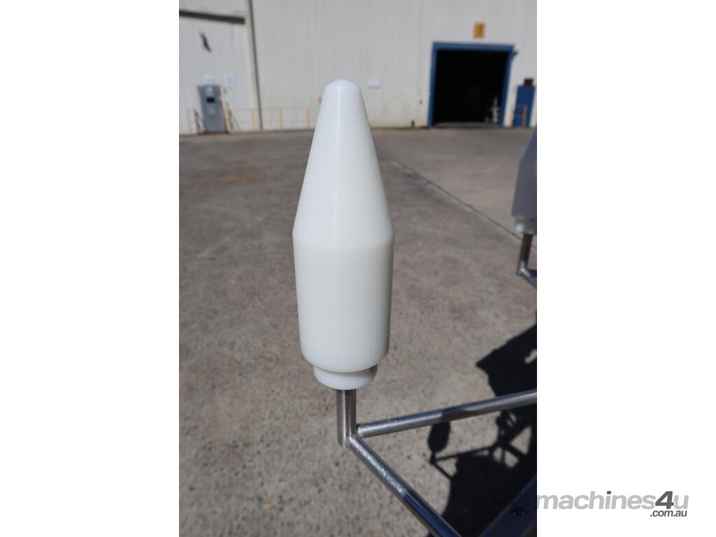 It allows for convenient cutting of elements from poultry carcasses mounted on a cone moved by a chain conveyor.