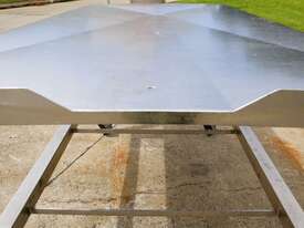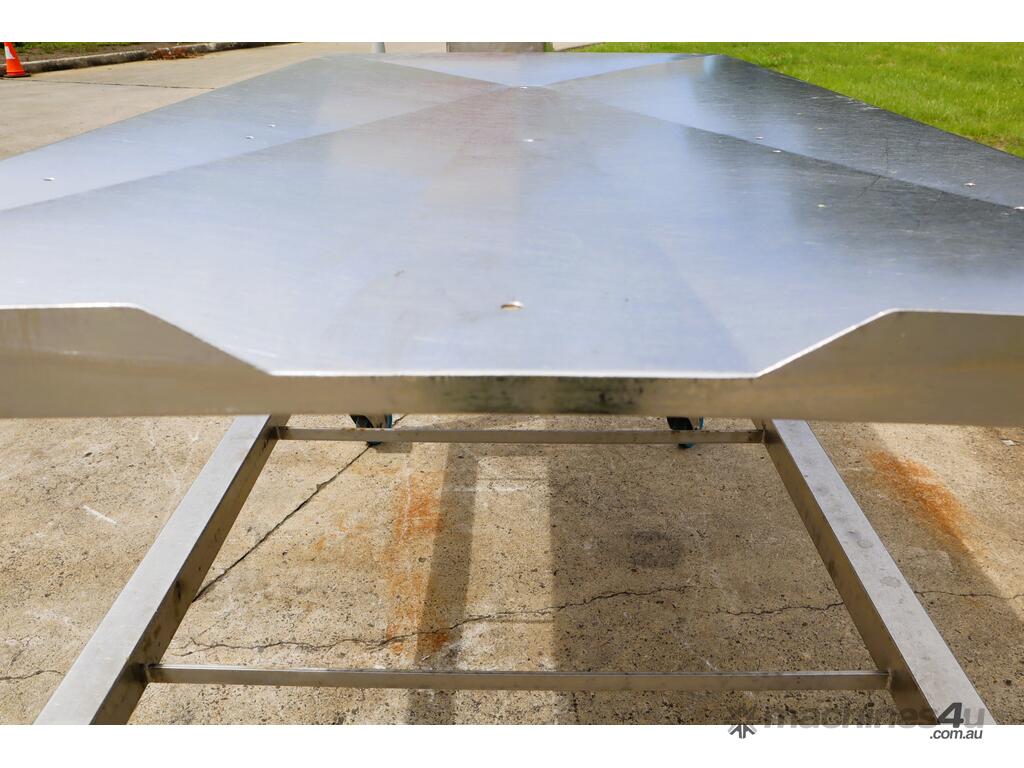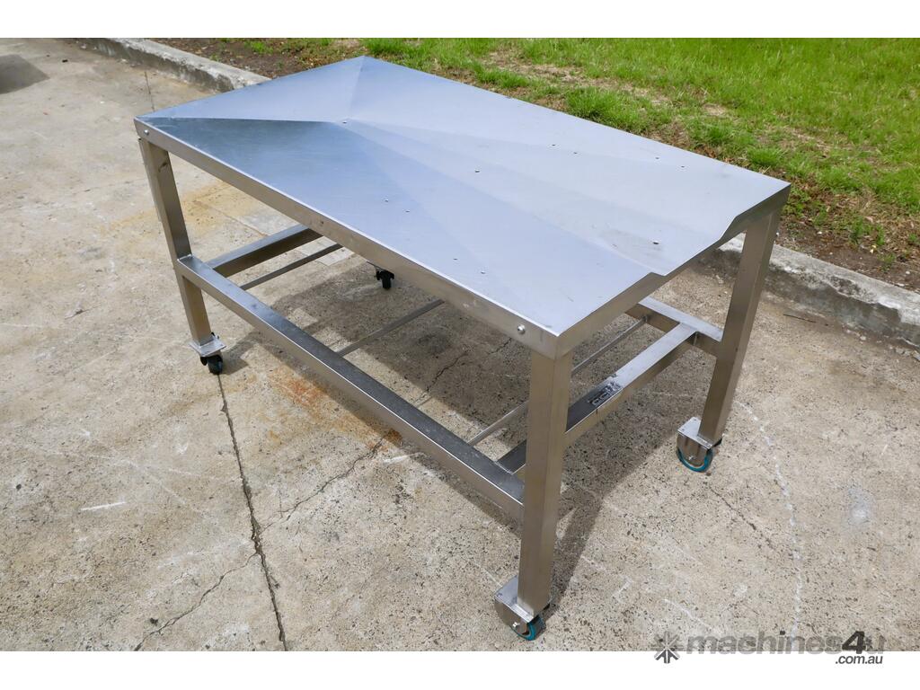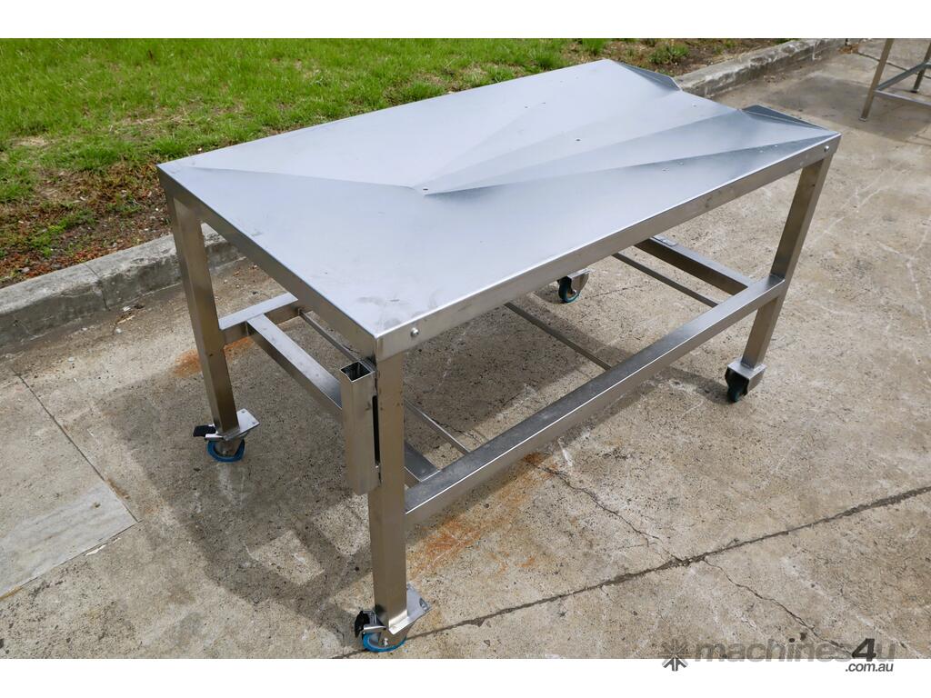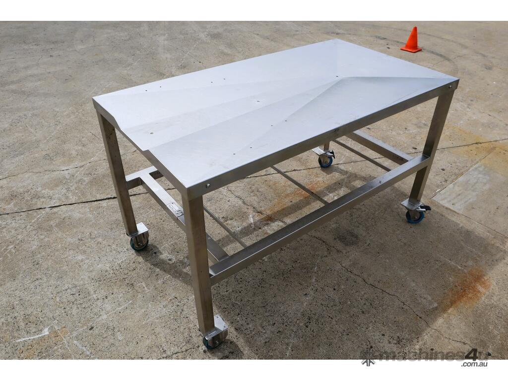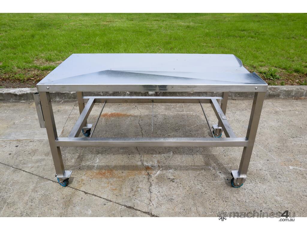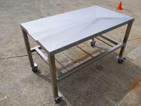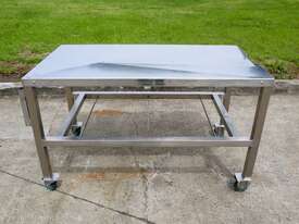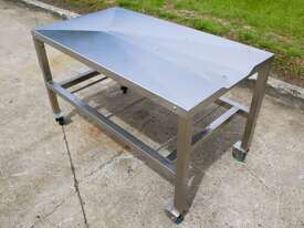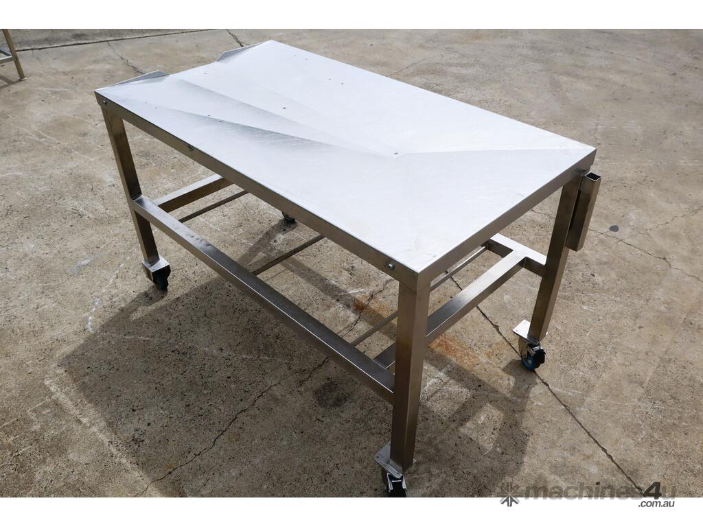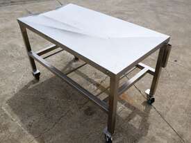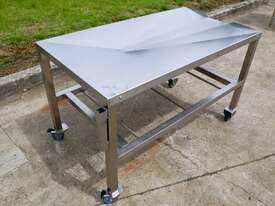 Stainless steel work table/trolley in great condition designed for hygienic production areas. Provides a solid, flat working surface with integrated mobility, allowing easy handling and movement of tools, product, or equipment.