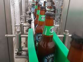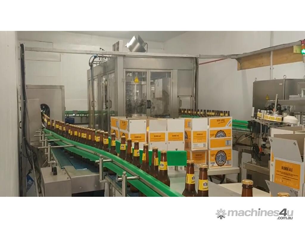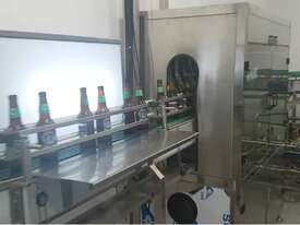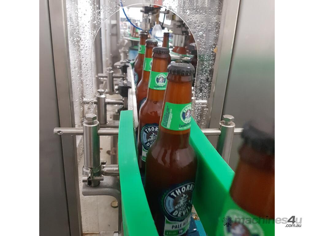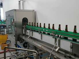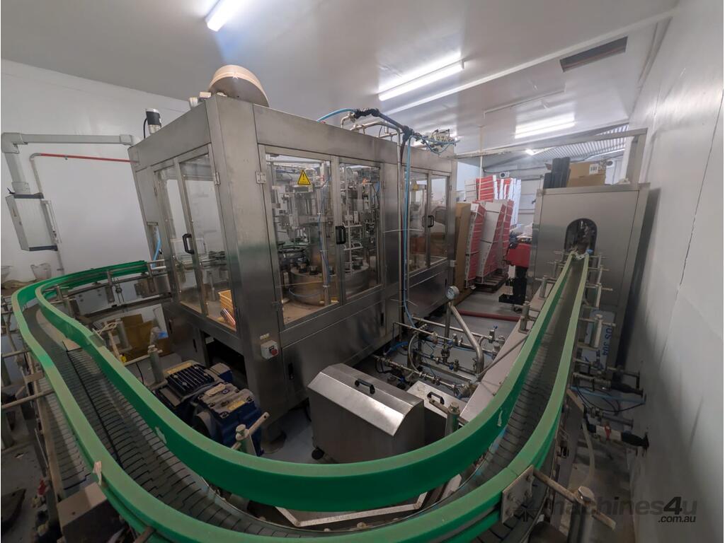 Full line includes: infeed table, accumulation table, blow drier, fill-level light, label machine, inkjet date coder, UV cap sterilisation cabinet, all conveyors with auto start/stop