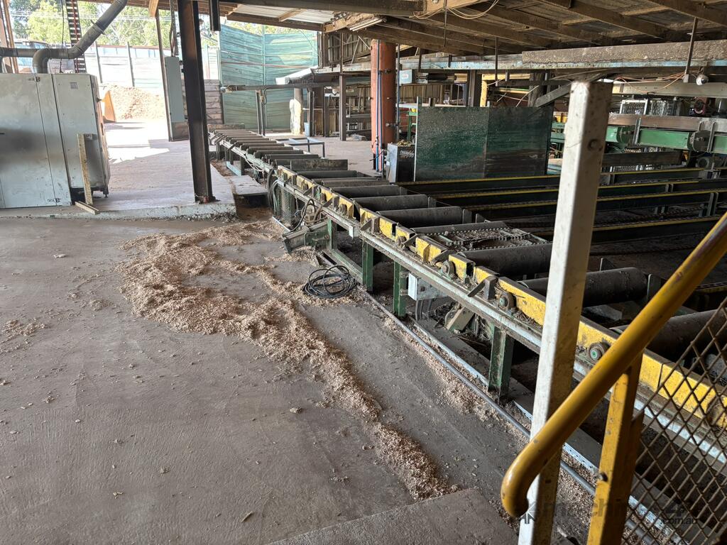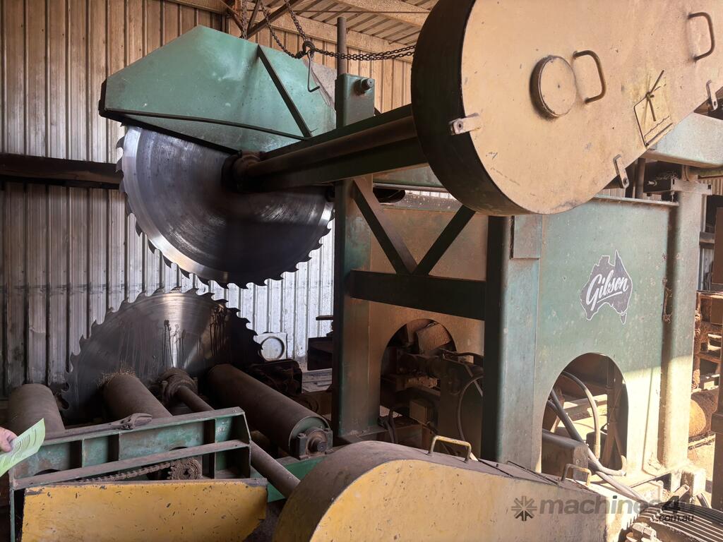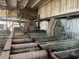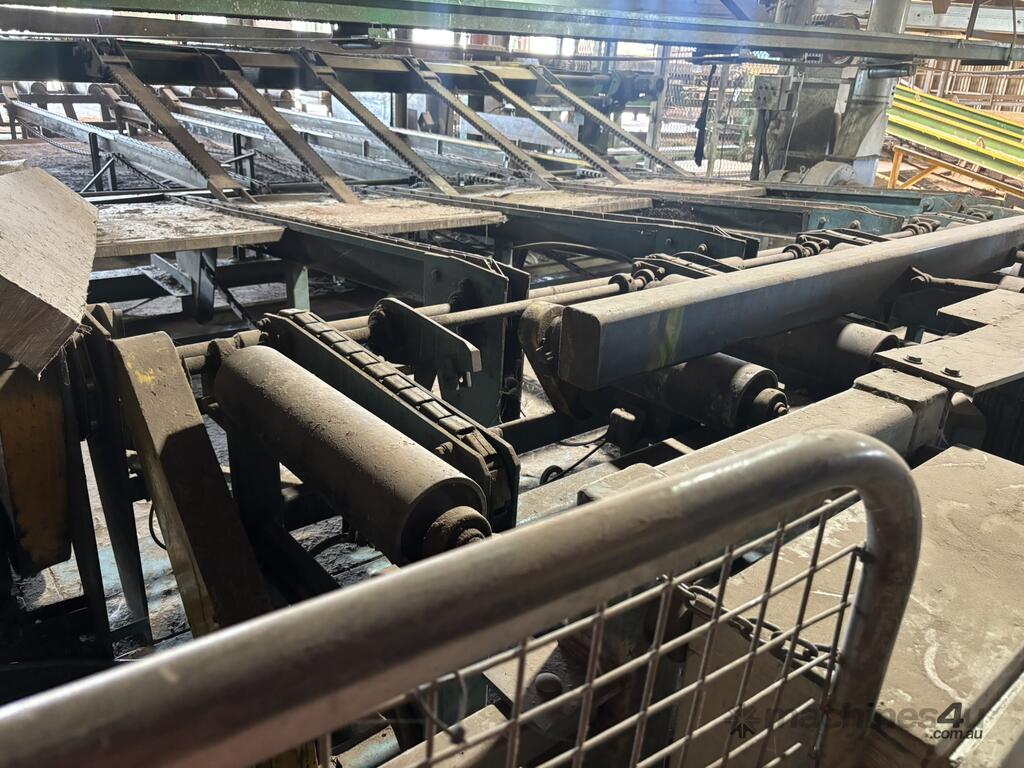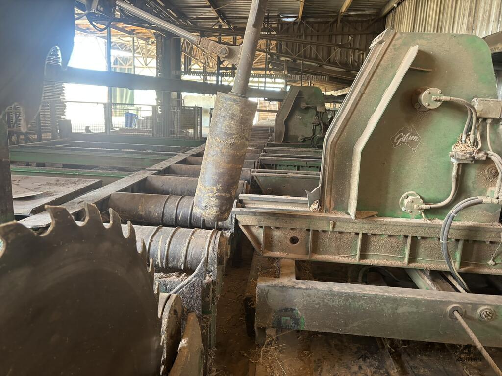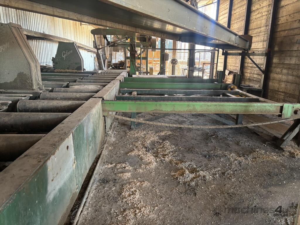 Complete Hardwood Sawmill, comprising three strand heavy duty log infeed with log loader, Gibson 3 knee line bar carriage, operator cabin with setting system and controls, twin saw breakdown, hydraulic winch, outfeed rollcase with storage chains for re entry, dust extraction with cyclones, rollcase with sweepers to Grey one man bench or additional rollcase to exit the mill, complete Grey one man with associated conveys and roundabout with cant rotating device for quarter sawing, outfeed to semi auto stacker and docking line, extremely well maintained, recently shut down.