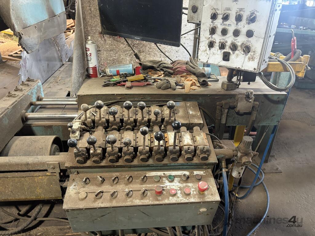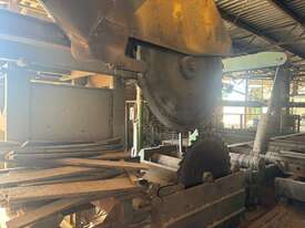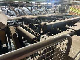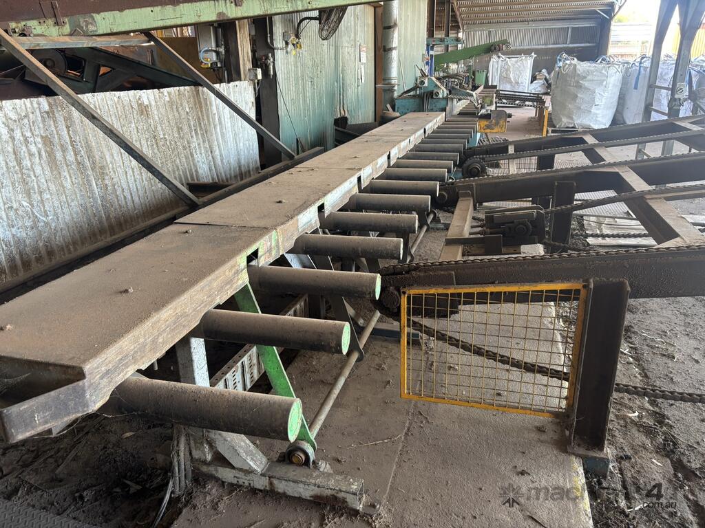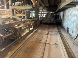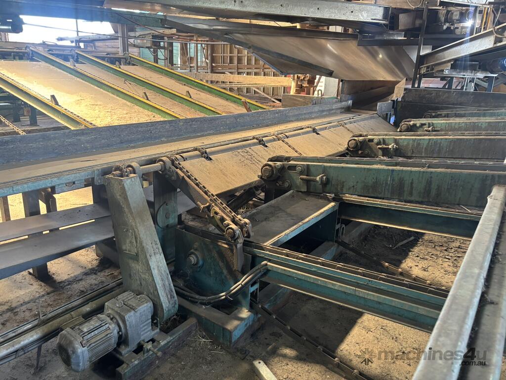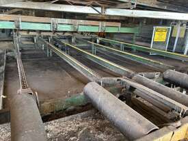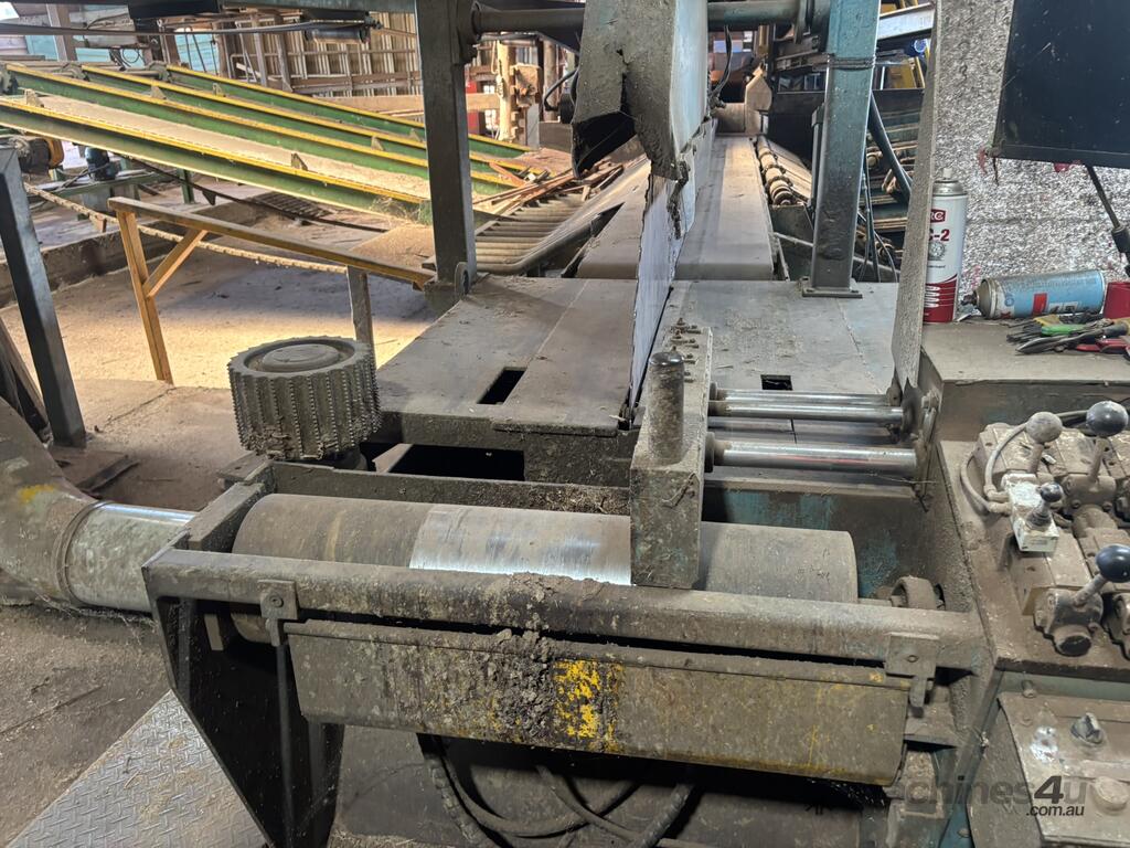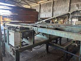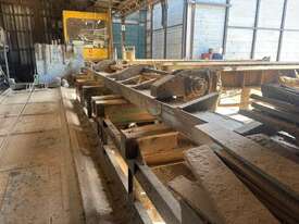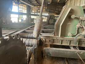 Complete Hardwood Sawmill, comprising three strand heavy duty log infeed with log loader, Gibson 3 knee line bar carriage, operator cabin with setting system and controls, twin saw breakdown, hydraulic winch, outfeed rollcase with storage chains for re entry, dust extraction with cyclones, rollcase with sweepers to Grey one man bench or additional rollcase to exit the mill, complete Grey one man with associated conveys and roundabout with cant rotating device for quarter sawing, outfeed to semi auto stacker and docking line, extremely well maintained, recently shut down.
