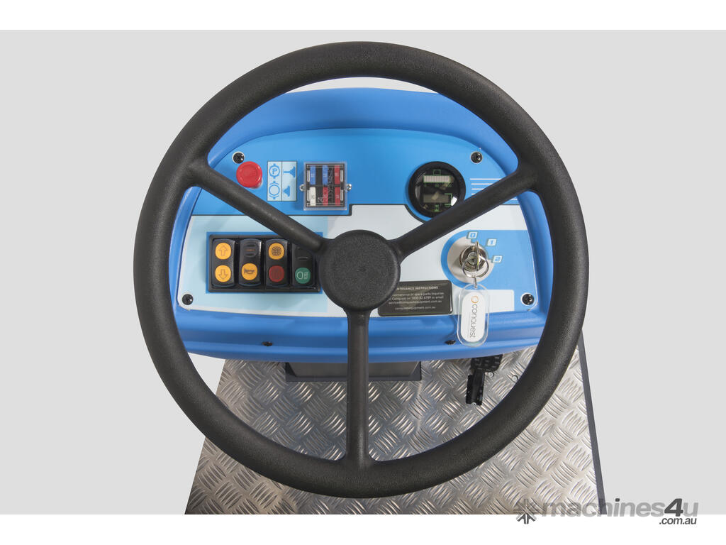 The large puncture-proof wheels, wheel-out debris hopper and superior dust control, all work together to take the effort out of sweeping. With one main broom, a single side broom and an optional on-board vacuum this industrial floor cleaner is perfect for medium to large commercial and industrial spaces, delivering a dust-free clean every time. The direct throw sweeping system pitches debris into the 65L hopper allowing for longer use before emptying. Forged from powder coated steel, ensures waste hopper is resistant to cracking and warping over time. With self-levelling, spring loaded brushes that can be raised and lowered at the flick of a switch, the HD90 is able to clean across multiple surfaces without having to stop to manually adjust brushes. The Conquest HD90 is the compact floor sweeper of the future.