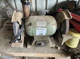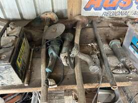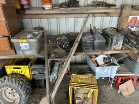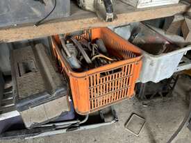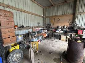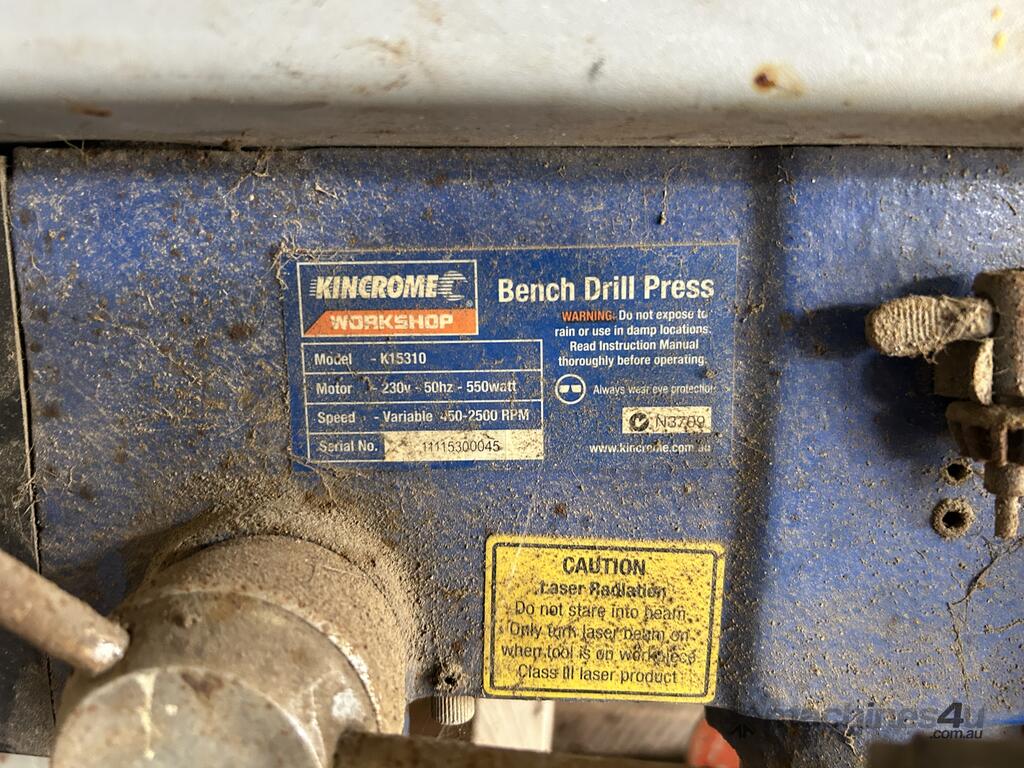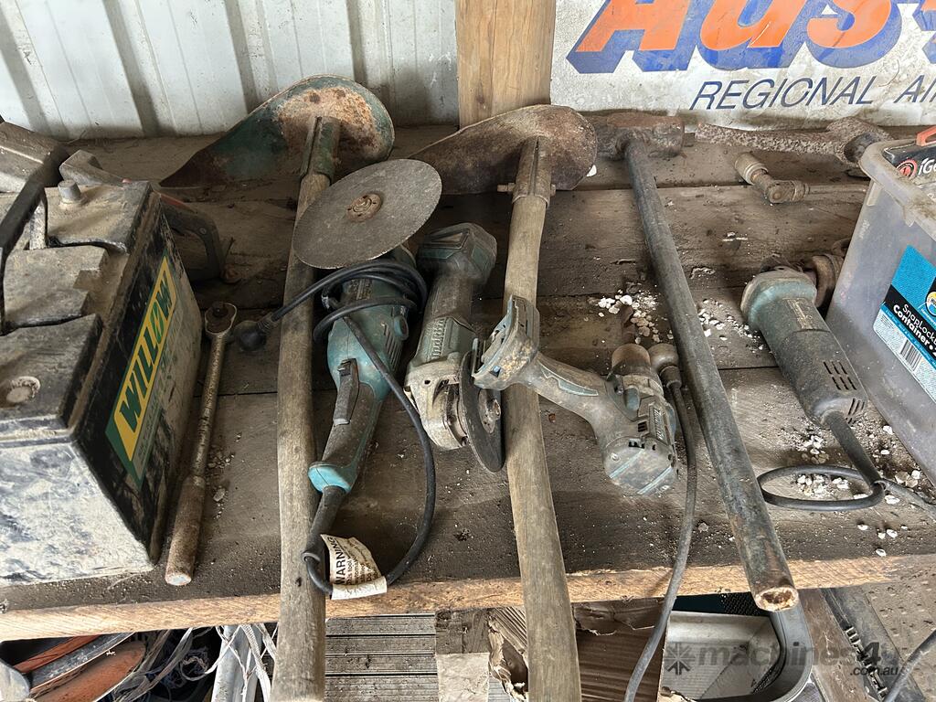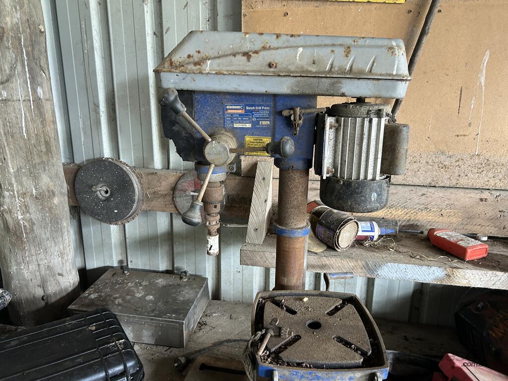 Contents Of Corner Workbench Area Including: Power Tools; Bench Drill Press; Bench Grinder; Etc