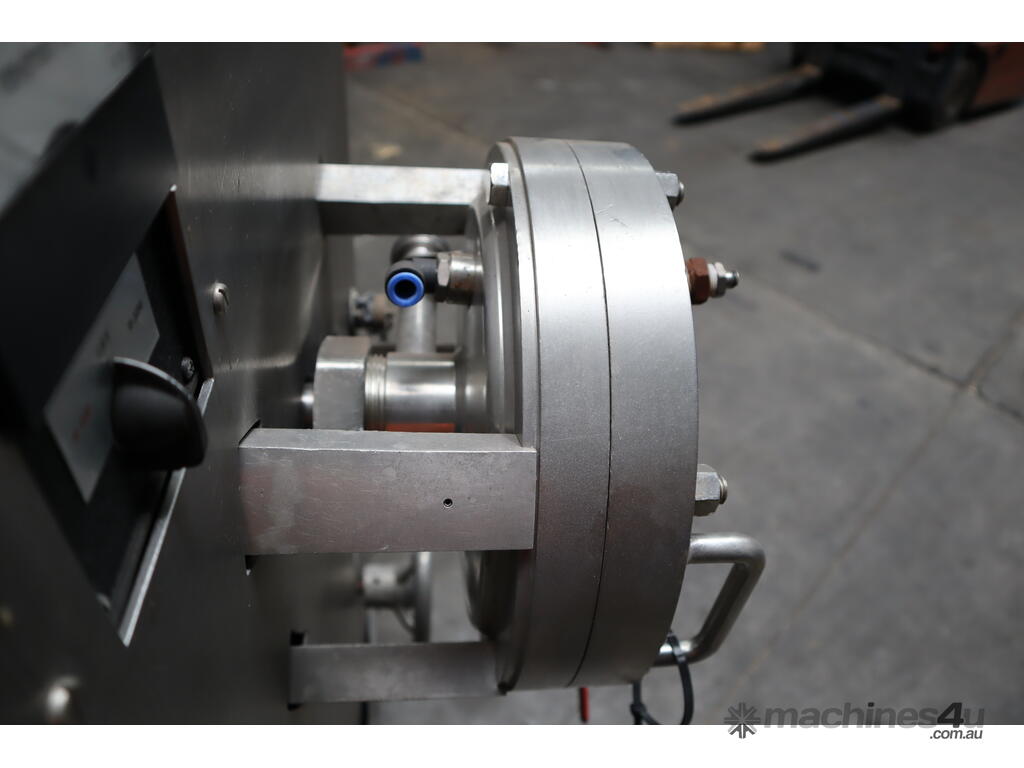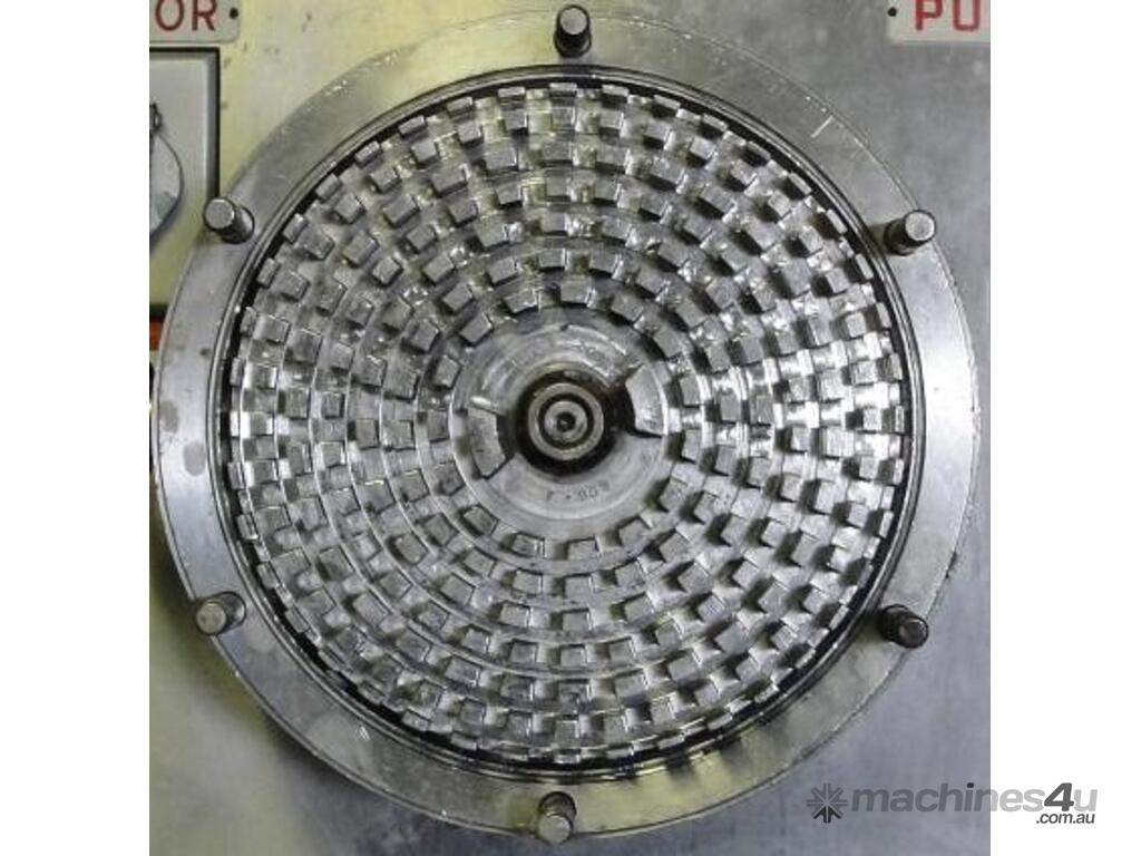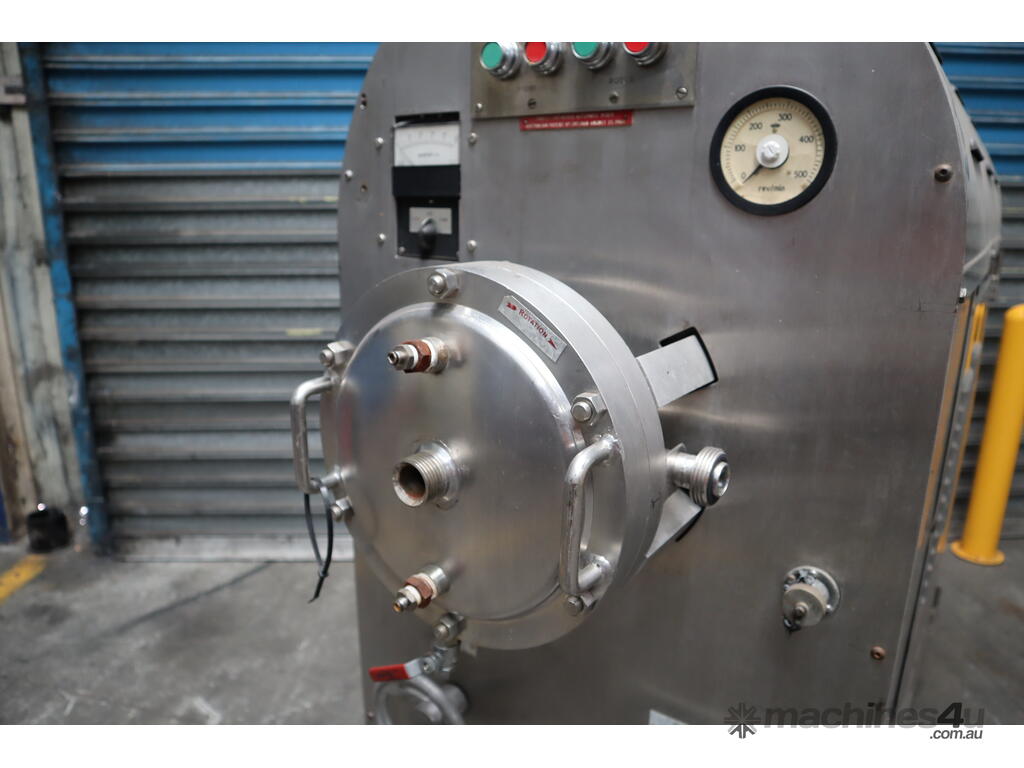 Stainless steel construction. Mixer has a 125 to 2000 pound per hour capacity depending on the product. The mixer has a 10`` diameter jacketed mixing head and a 1`` inlet and outlet.