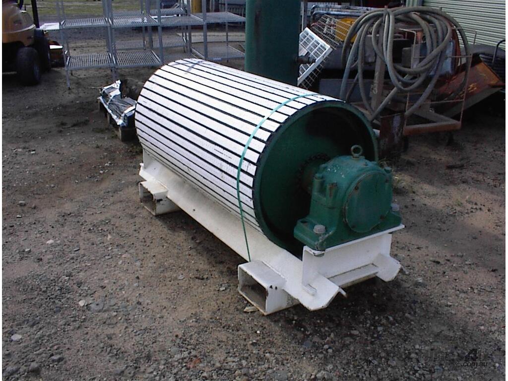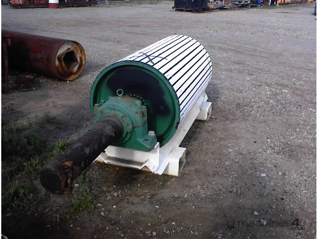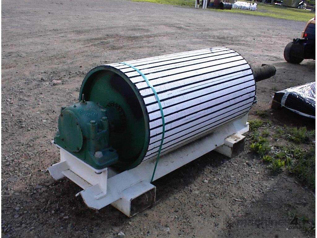 Conveyor head drum/drive pulley, 1400mm face x 720mm diameter, with keyed shaft, 2x SDD3134 bearing blocks, rebuilt with new ceramic lagging, as new condition.