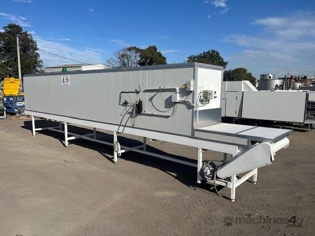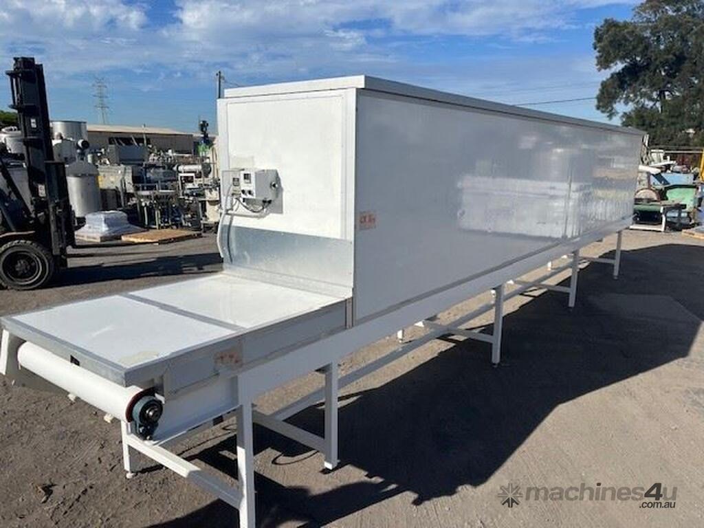 Cooling conveyor 8.5m long x 900mm wide 400mm internal height. 0.37kw SEW geared drive 8.8rpm. Requires refrigeration for cooling.