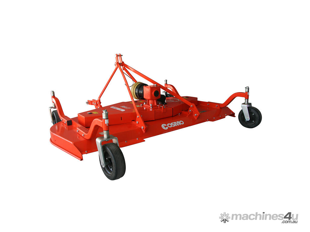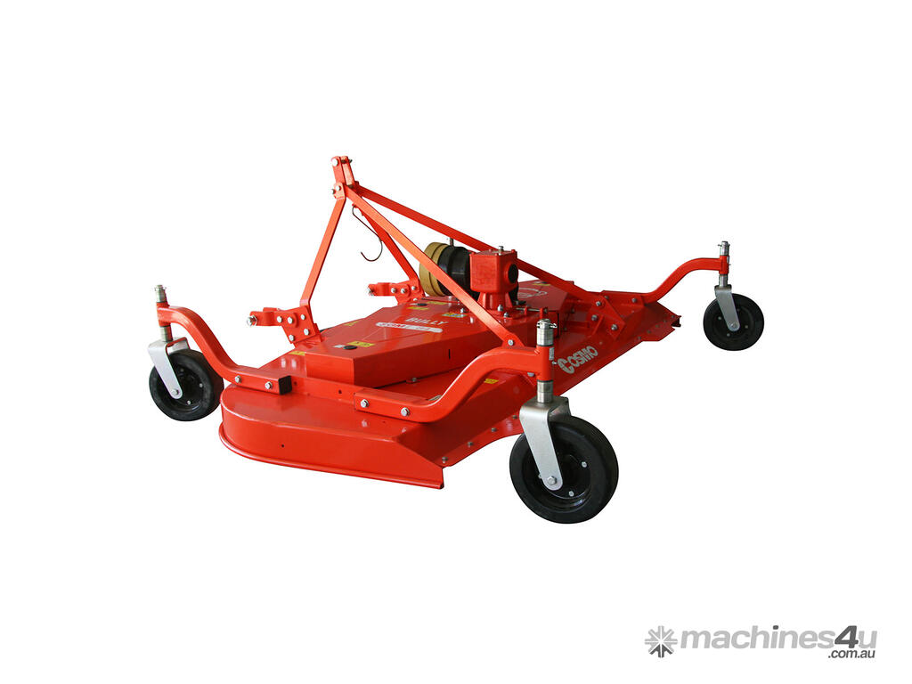 COSMO BULLY SGM Finishing Mowers are designed to groom lawn and grass areas professionally; three (3) suction type blades turn at a high tip speed giving tender grass a fine, sharp cut. Four (4) solid swivel wheels allow the mower to follow the contour of the ground resulting in a precise and level cut in undulating conditions. Cutting height can be adjusted by adding or removing spacers on the caster wheel shafts, and an antiscalping roller is standard. Attached to the back of a 25 to 60hp