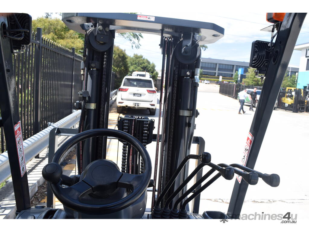 Fitted with side shift, solid puncture proof tyres, suspension seat, roof cover & lighting kit.