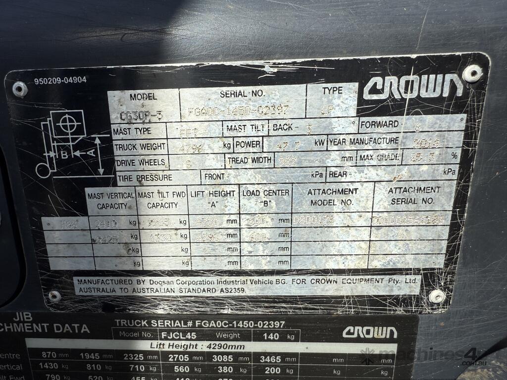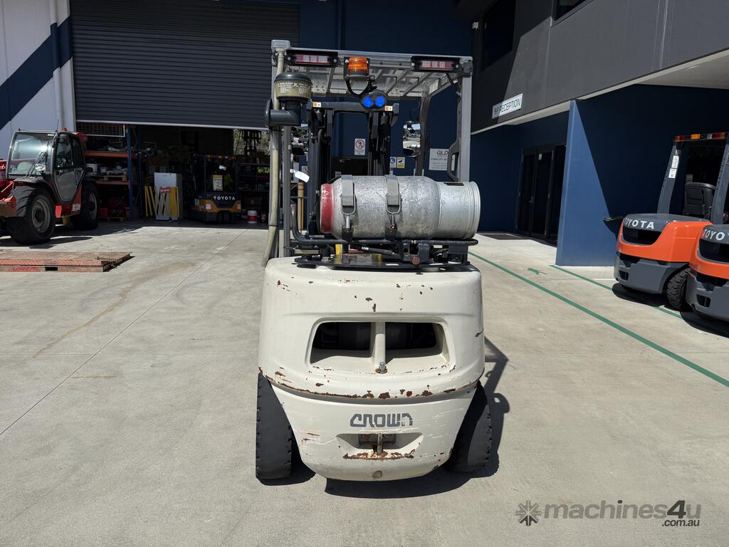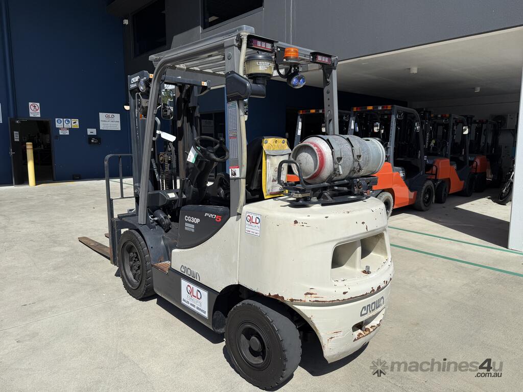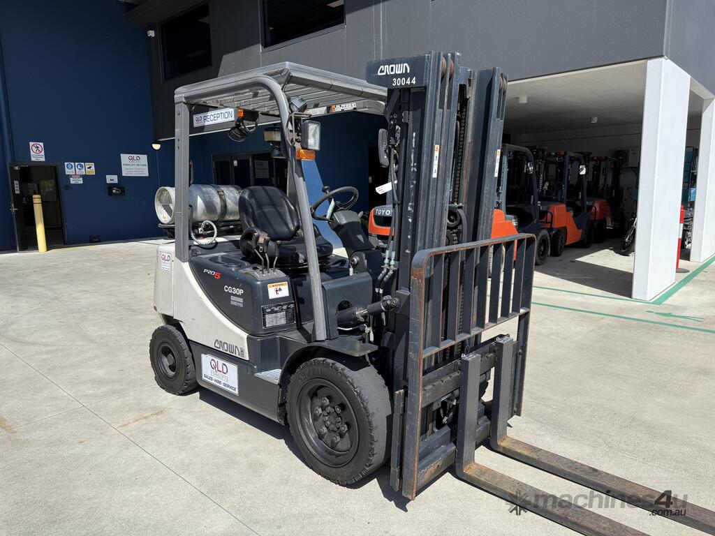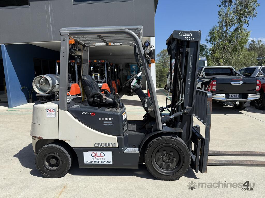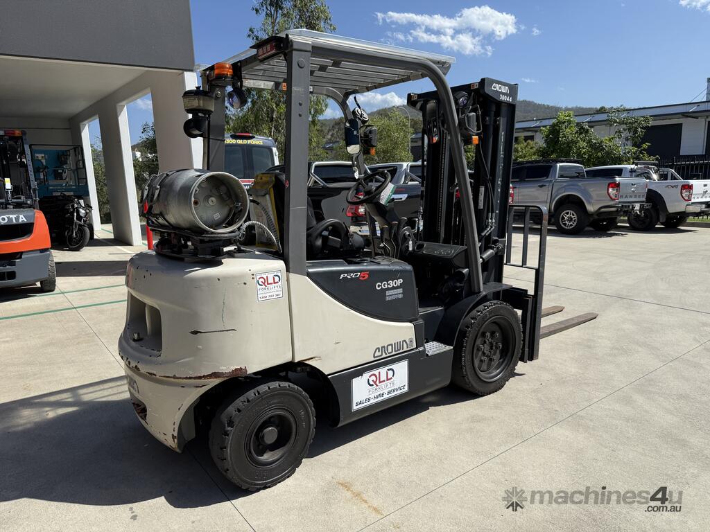 Crown 3.0t CG30P-5 Forklift. This unit has a Container Entry mast, with Sideshift and LPG. Low hours, solid tyres, suspension seat. It's been through our workshop and has been fully service. This is surplus to our needs and has been in our Rental Fleet with a full service history.