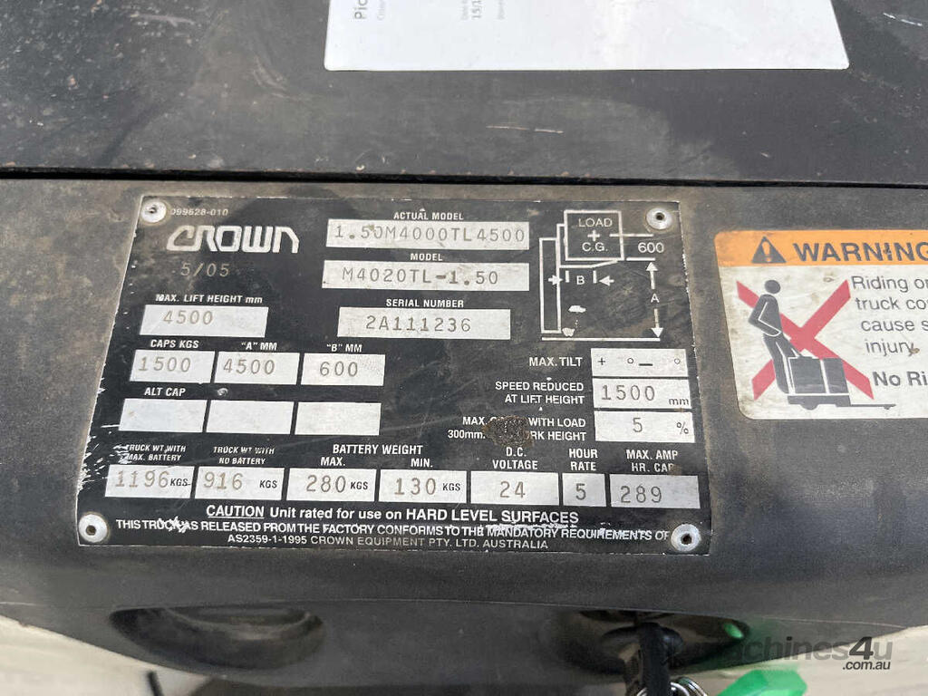 No C/P,Crown,M4020TL-1.50,Walk Behind Forklift,Electric,Odometer not visible,111 (Hrs. Showing on Hour meter),Colour: Grey,Unregistered,Serial No: 2A111236,Sold with No Plates