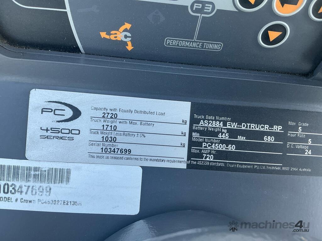No C/P,Crown,PE4500-60,Stand On Pallet Jack,Battery,Odometer not visible,108 (Hrs. Showing on Hour meter),Colour: Orange,Rego. No: NP(10347700), Unregistered,Serial No: 10347699,Sold with No Plates