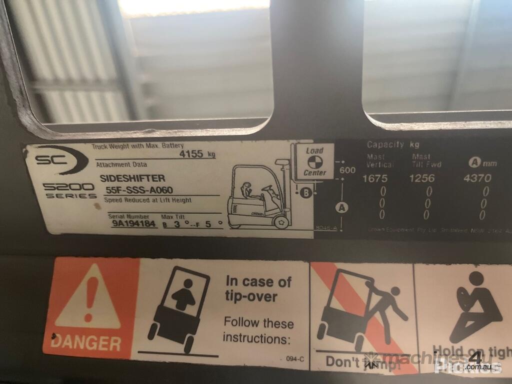 CP: CIRCA null,Crown,SC2000,Electric Forklift,Electric,Odometer not visible,1424 (Hrs. Showing on Hour meter),Colour: Beige,Unregistered,Serial No: 9A194184,Sold with No Plates