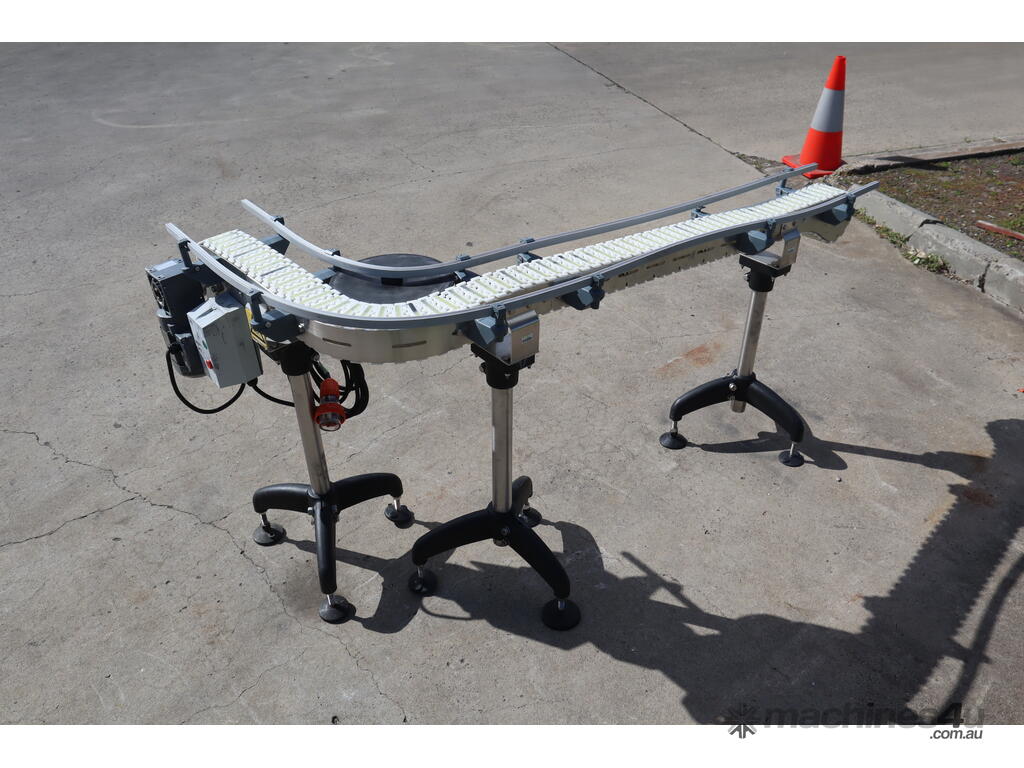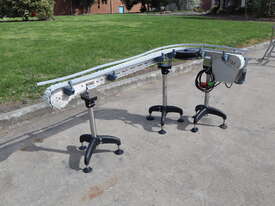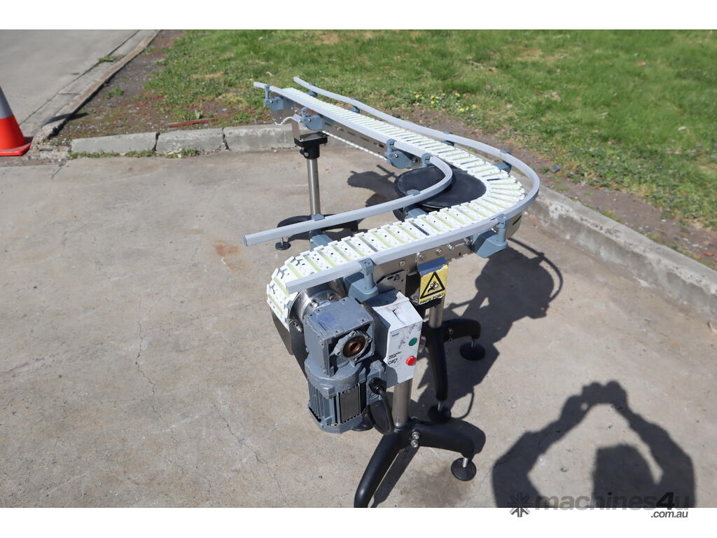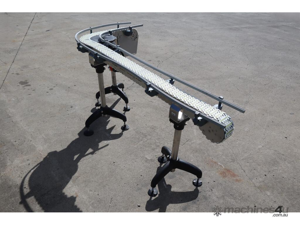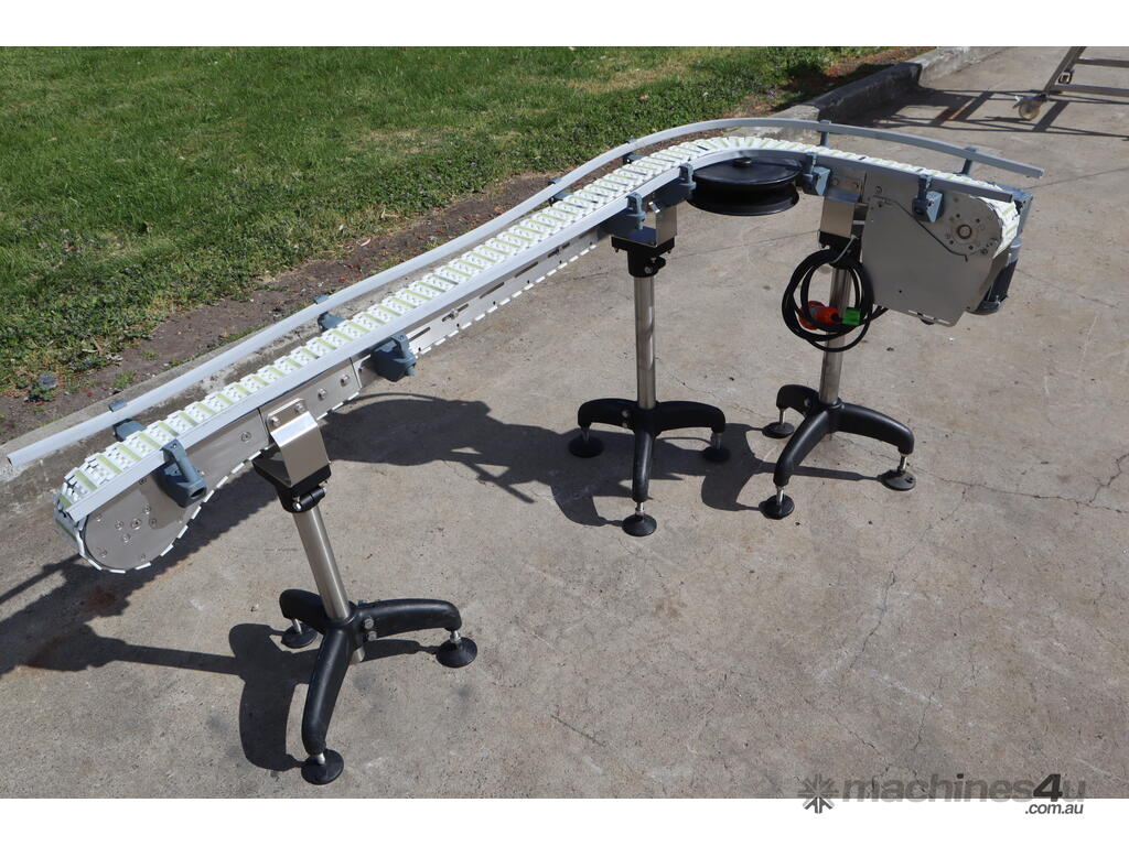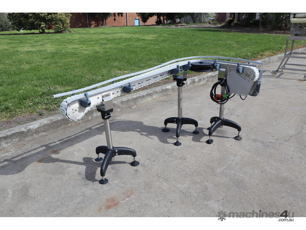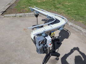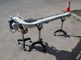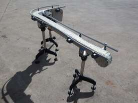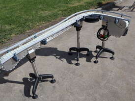 This compact modular chain conveyor features a curved path ideal for transferring bottles between processes. It comes fitted with adjustable stainless steel stands for easy height alignment and mobility and a plastic link belt, ensuring smooth, reliable transport of products through bends without snagging or slippage.