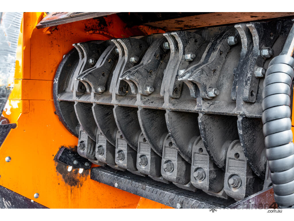 -Freely swinging flails of the flail drum, with a flywheel mass of approx. 1.3 t, have quickly individually exchangeable flail tips that are adapted to the material specifically (e.g. hard metal or armored tips)