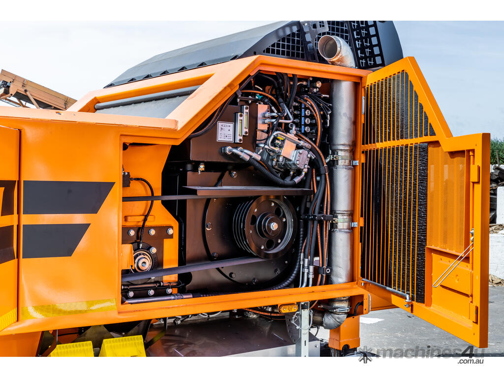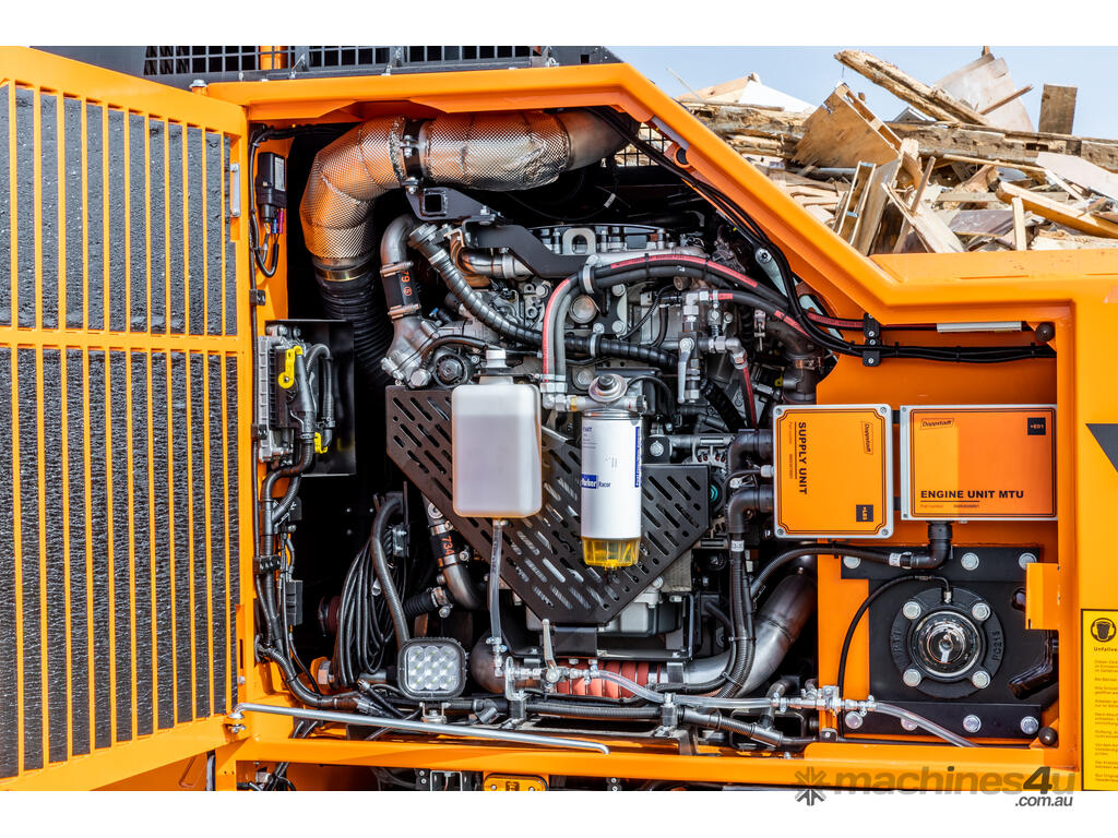 Despite the dimensions of the AK 640 SA in working condition, the transport dimensions of 12 m (length) and 2.5 m (width) allow it to be moved easily. The new MTU 6R 1500 diesel engine with 20 kW more power meets the Stage V emissions standard. Other features of this high-speed shredder include the completely new stainless steel piping of the exhaust system and the highly effective shielding of the exhaust aftertreatment system through integral insulation, which optimizes fire protection.