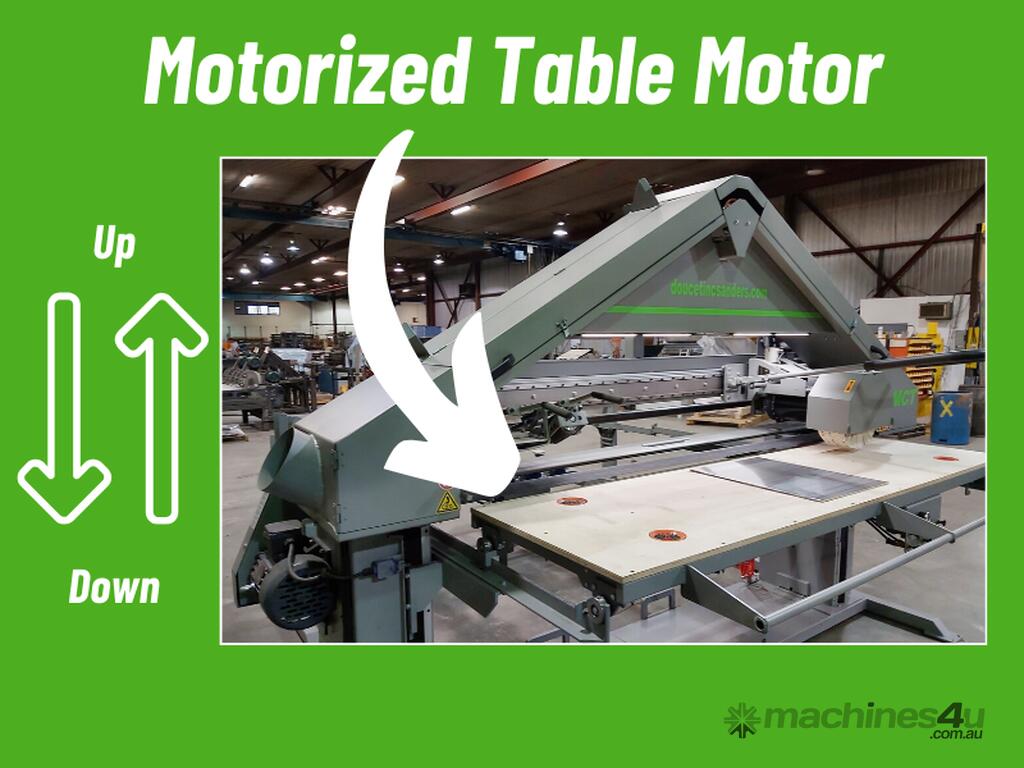 The triangular shape allows better visibility on parts, better heat dissipation and belt saving. Table is covered with with Russian Cherry wood plywood surface. Motorized vertical table with 25" vertical adjustment. Total weight capacity is 1000 lb.